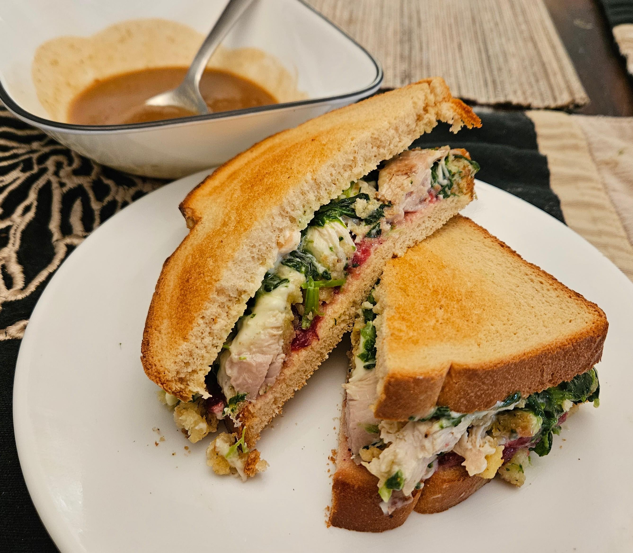 Whole grain white bread, mayo, creamed spinach, turkey, American cheese, stuffing, and cranberry sauce, with a side of gravy for dipping.