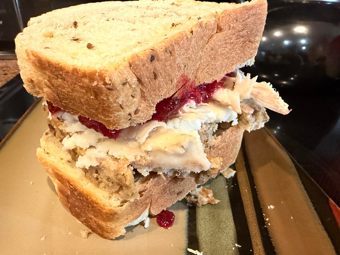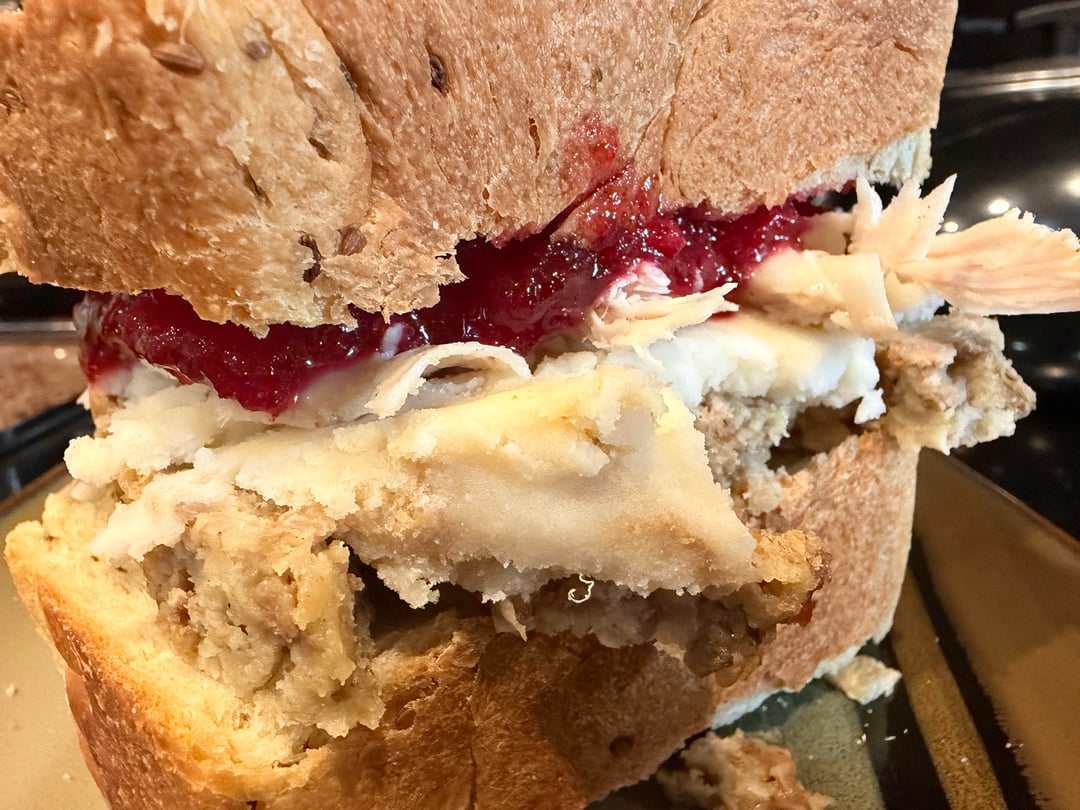 Homemade herb bread, homemade cranberry sauce, homemade sausage/hamburger stuffing, turkey and homemade onion and chive whipped potatoes. Heaven. Hard to get your jaws around, though. But worth the pain 😀