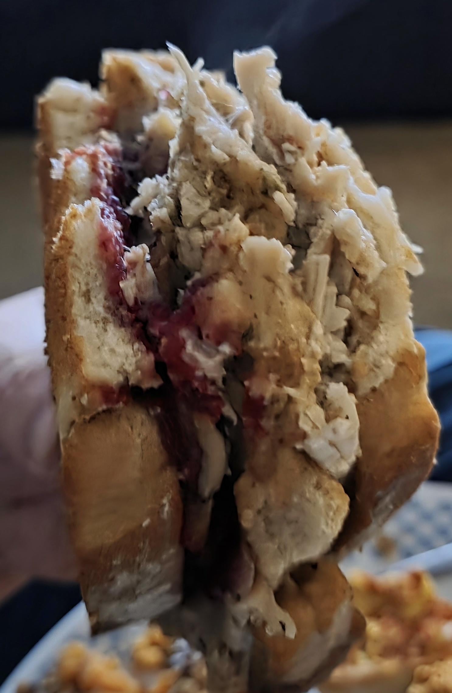 Top to bottom: Toasted artisan white bread, mayo, shredded white meat, stuffing, gravy soaked mid toast (moist maker), shredded dark meat, stuffing, cranberry sauce, toast.