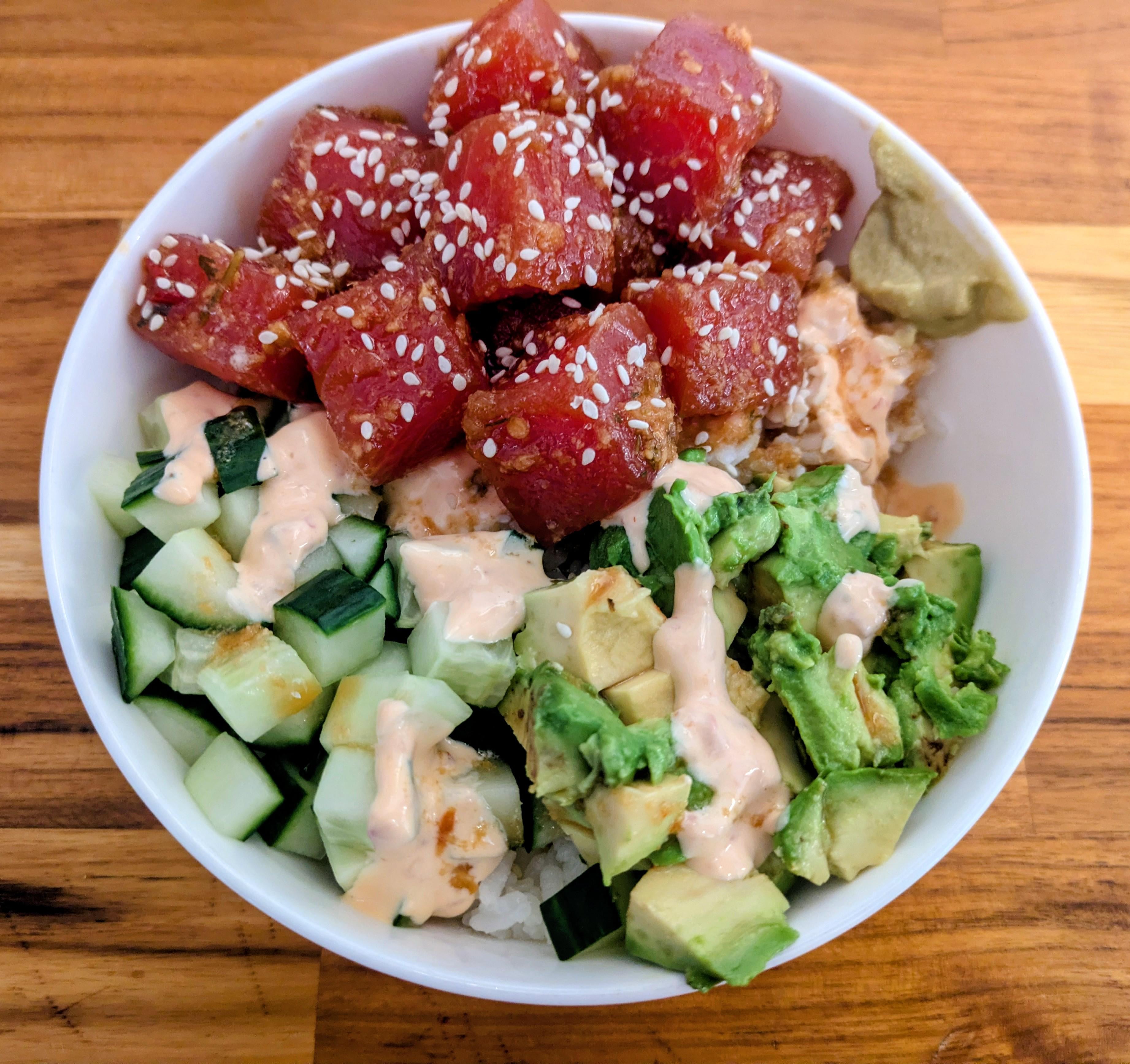 One hour marinated tuna with warm sushi rice, chopped cucumber and avocado, and homemade spicy mayo by Krissy_loo Food Porn