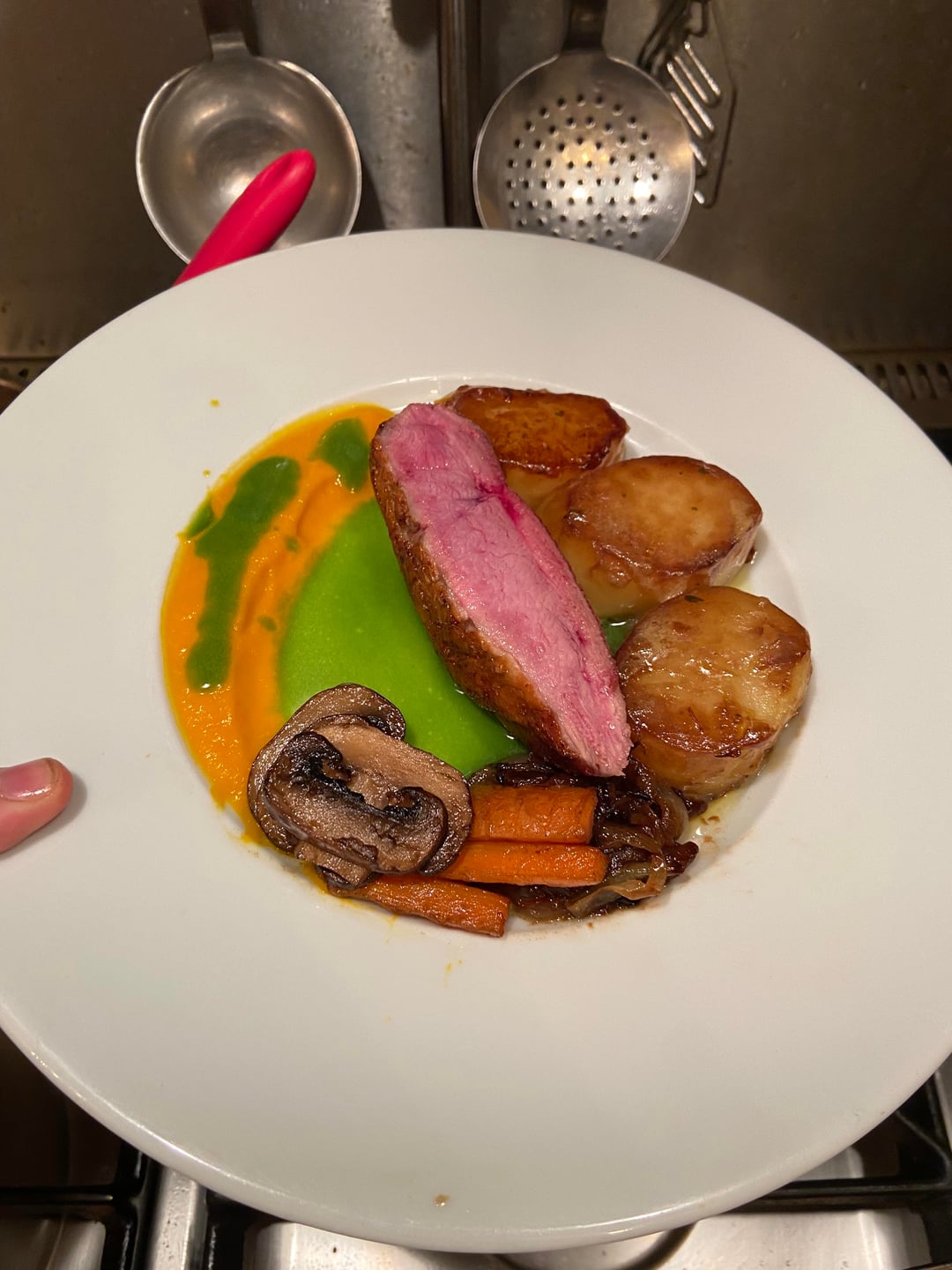 That’s a very nice cook on the duck. The potatoes look great as well. I think the biggest issue is the plate itself. Everything is too crowded. Also less is more here no need for the mushroom, I would stick to the carrots and potatoes, possibly the onion but in a different texture maybe fried and crispy. Get yourself a nice flat plate do some carrot, lay down the duck, arrange your pots, add your sauce, garnish with your onions.