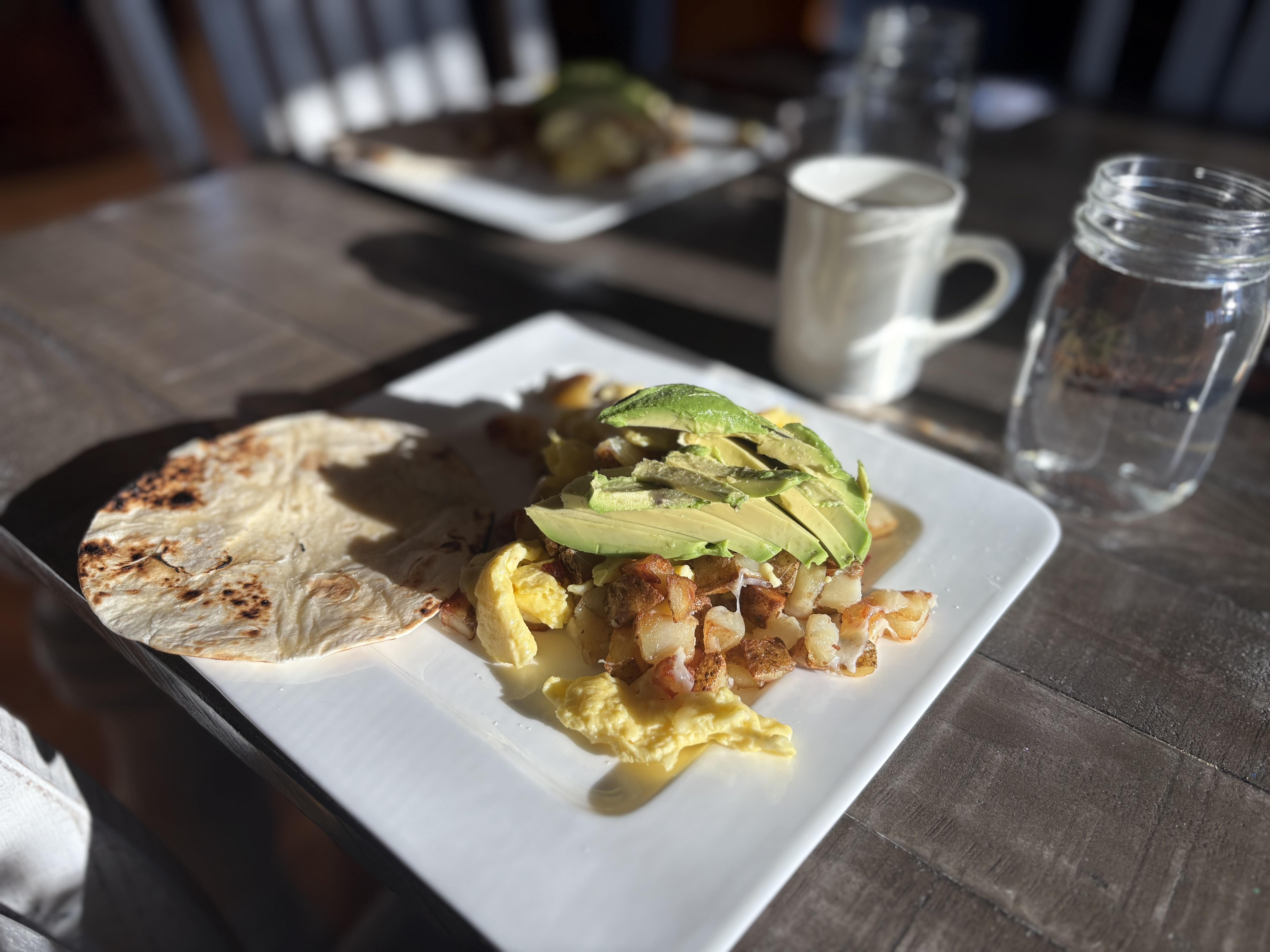 Breakfast scramble with eggs, potatoes, cheddar cheese and avocado
