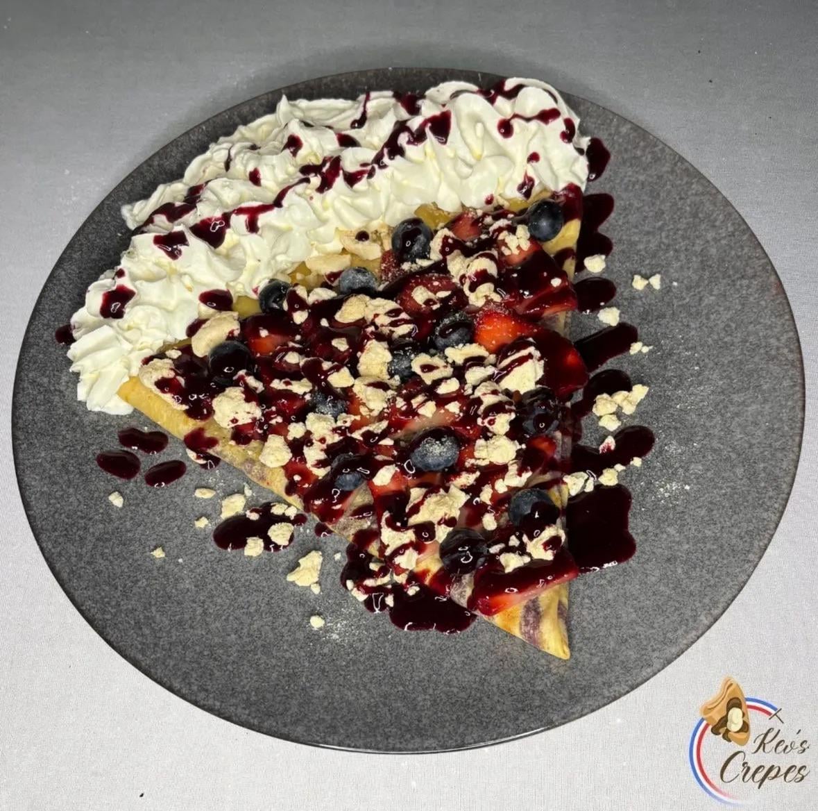 Homemade berry coulis, fresh strawberries, blueberries, meringue pieces and whipped cream. Always trying to improve Any feedback on the look? by KevsCrepes Food Porn