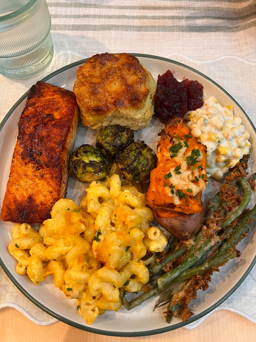 Affectionate-Tea-975 on November 30, 2025 4:58 pm Been living in the UK for 6 years now and every year I love hosting. Sadly everyone invited was busy/away. However, I still really love this time of year and my Brit hubby enjoys all the food too! * Air fried crispy skin salmon * Creamy four cheese macaroni * Twice baked sweet potatoes * Green bean casserole * Balsamic honey glazed brussel sprouts * Creamed corn * Buttermilk honey biscuits * Cranberry sauce * Gravy