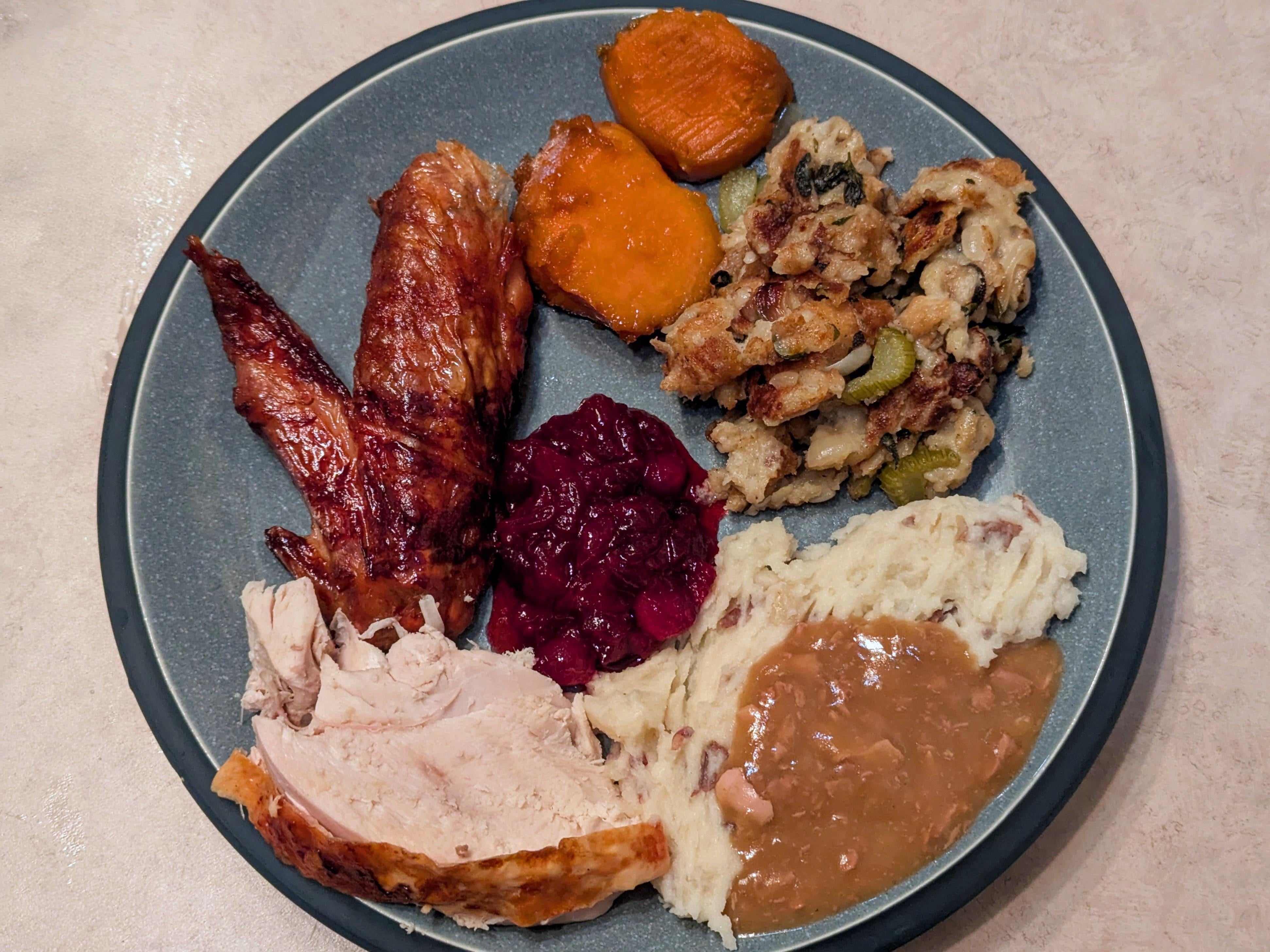 All homemade including the cranberry sauce. And used old family recipes everywhere, including the cast iron skillet stuffing. The brined turkey was cooked outside on the grill rotisserie w/ a dedicated ceramic IR burner. Everything came out excellent, highly recommended.