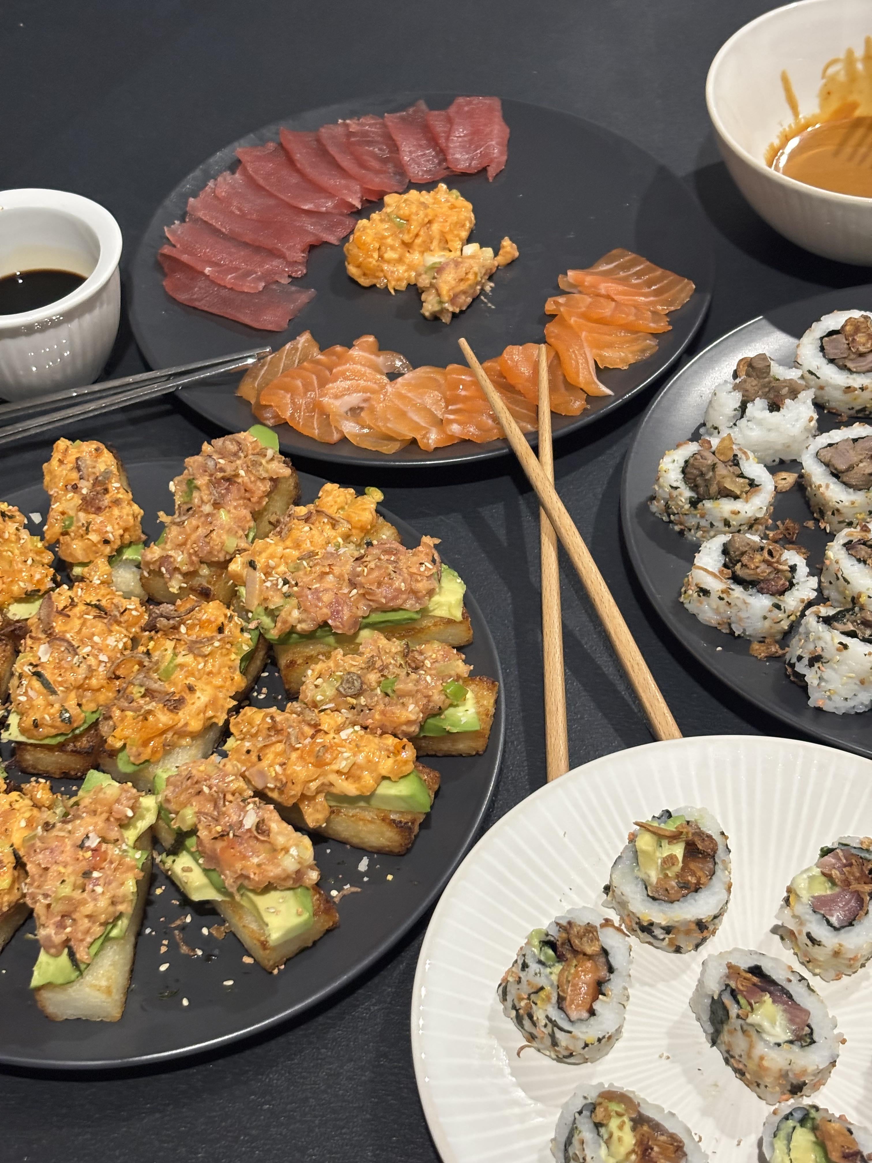 Tuna & Salmon Sashimi Tuna & Salmon Tartare Tuna & Salmon Rolls Beef Bulgogi Rolls Crispy Rice w/ Salmon & Tuna Tartare Sauce: Soy Sauce Kewpie Mayo, Sriracha, Sweet Soy & Sesame Oil by TheGullyBoys Food