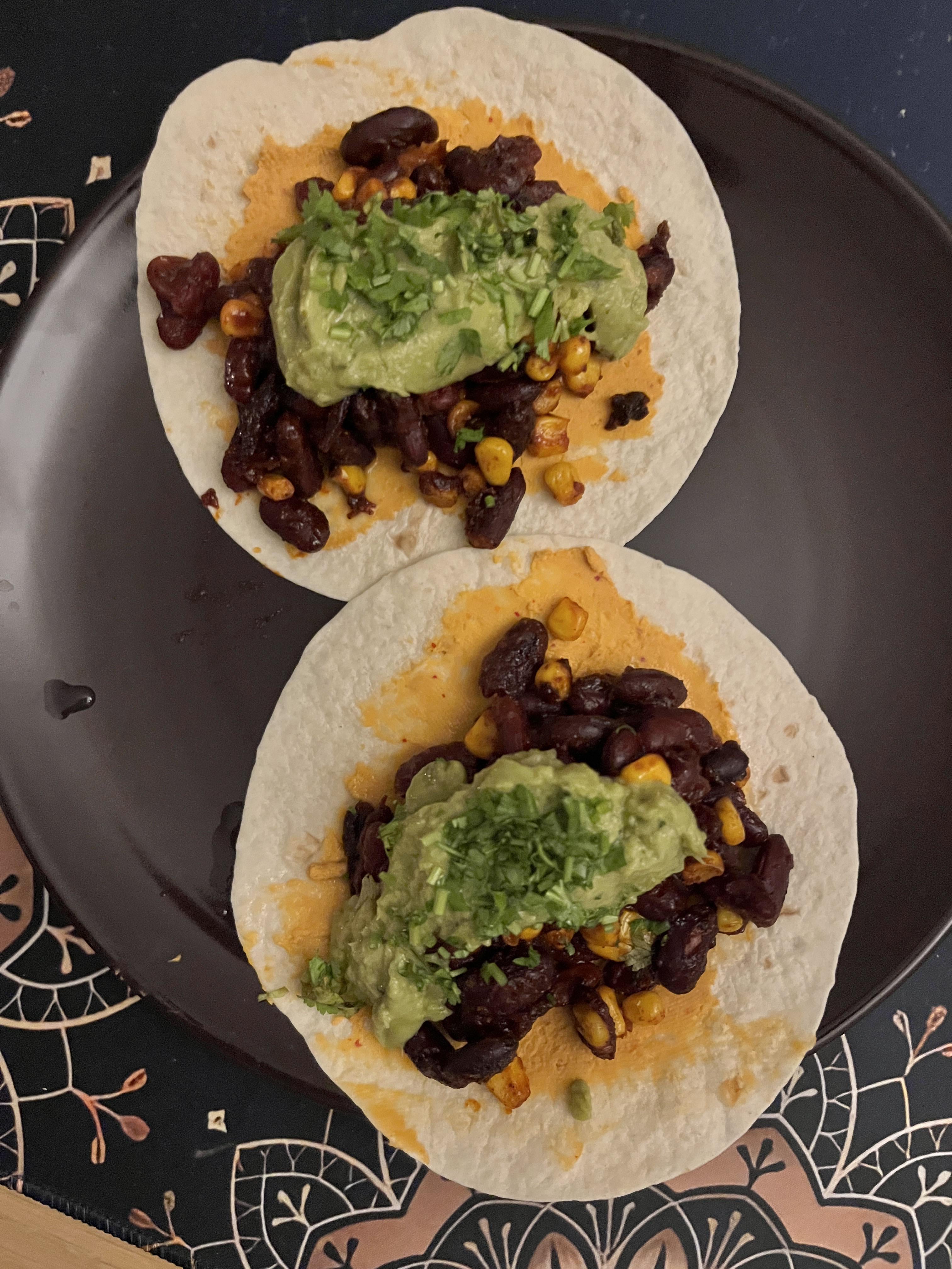 On the table tonight – simple tacos with spicy hummus, kidney beans and corn, Guac and coriander by Icy_lunette Dinner Tonight Tonight's Dinner