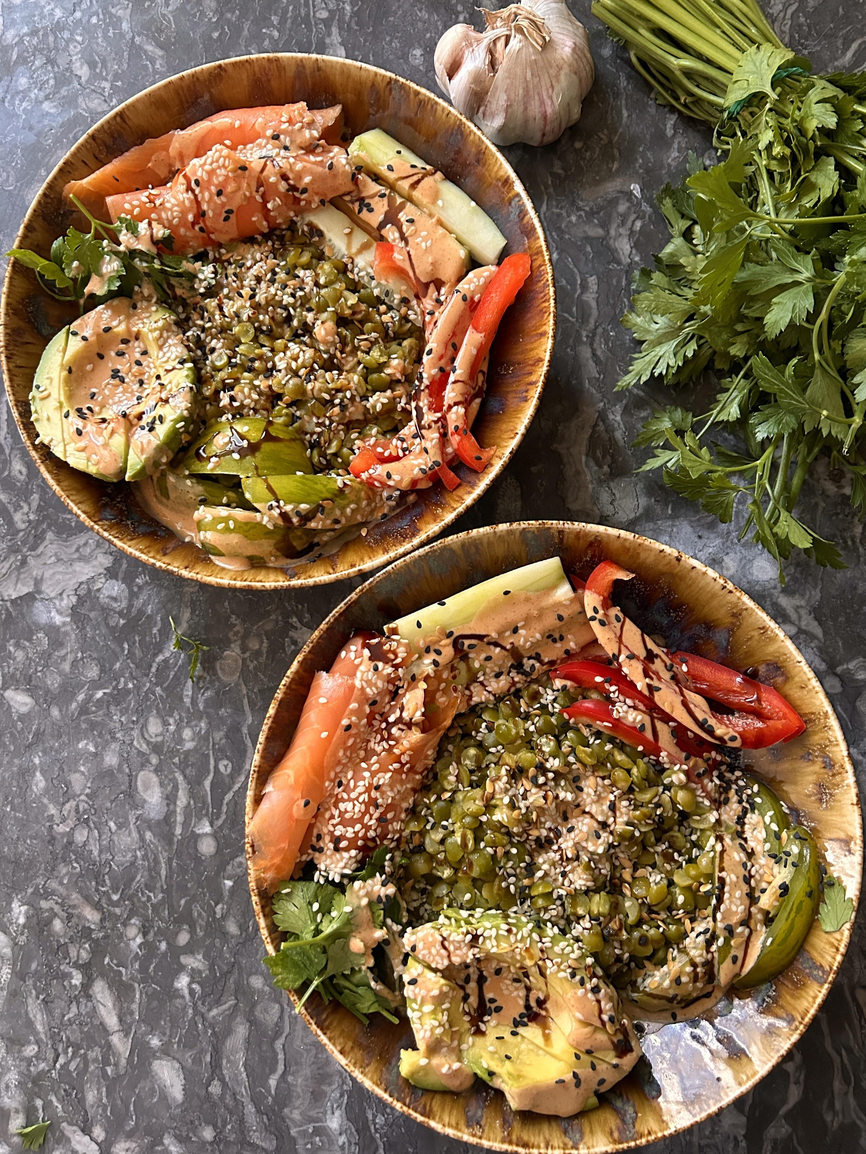 lentils, avocado, salmon, garden vegetables, herbs, homemade teriyaki sauce, homemade yoghurt dip and sesame by Electronic-Box9466 Food Porn