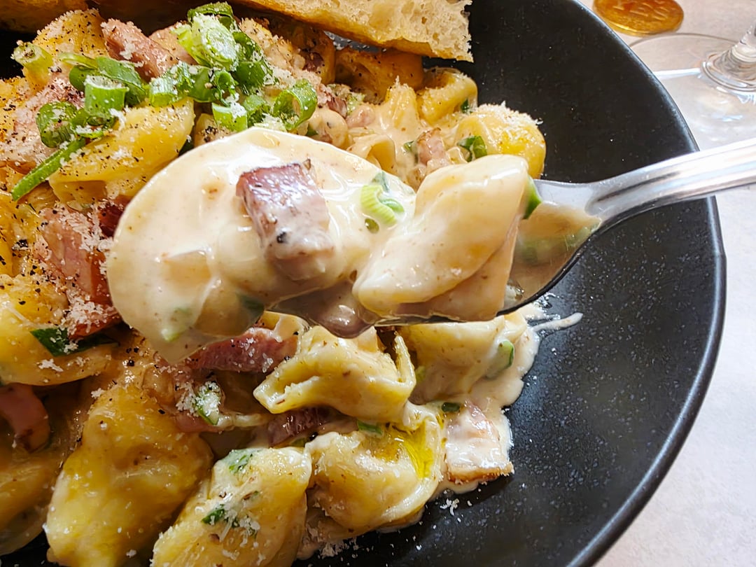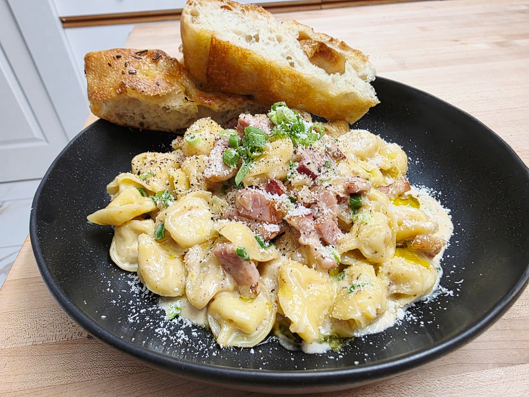 [Homemade] Four cheese cappeletti in bacon cream sauce with green onions