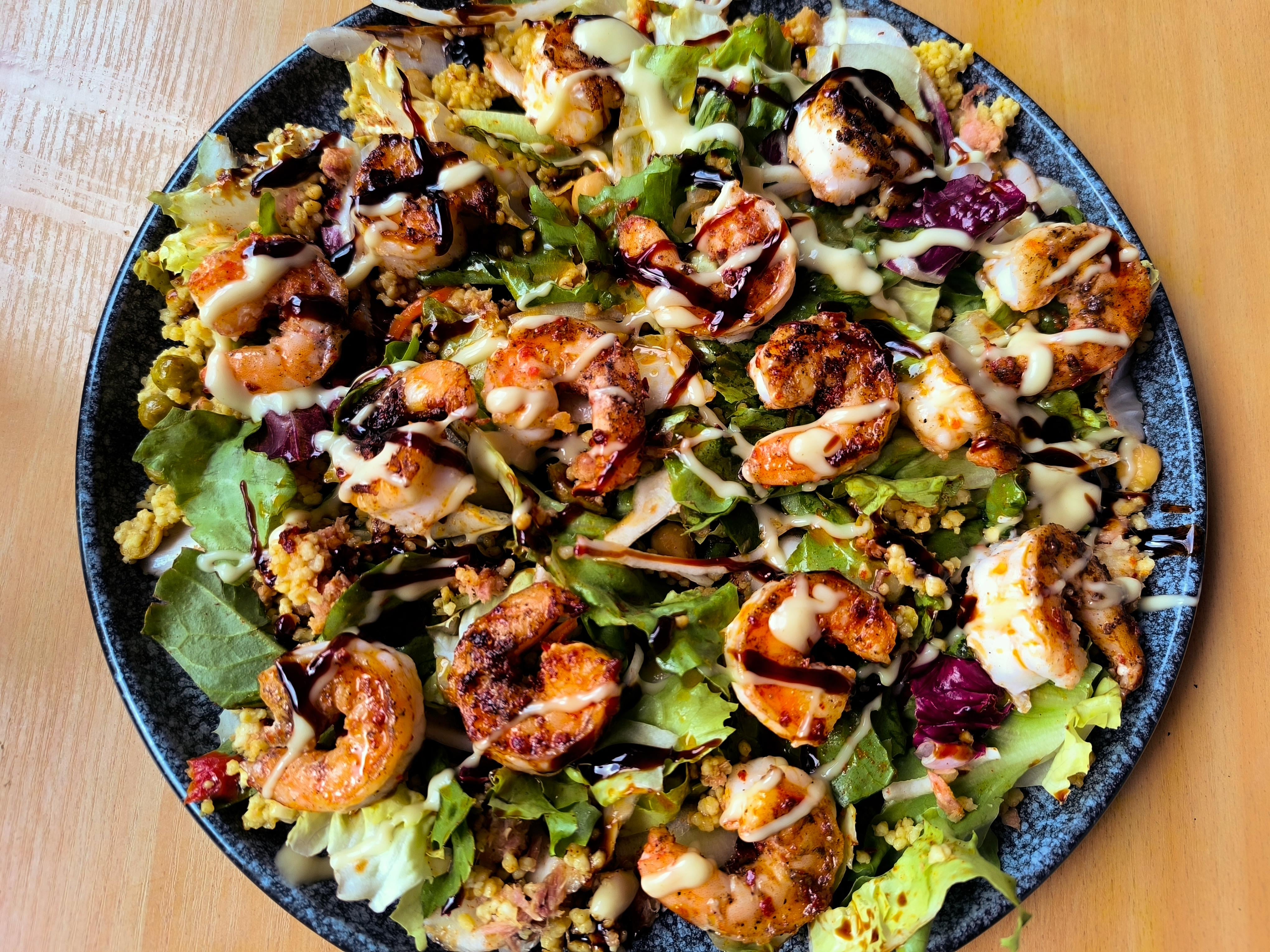 Cooked bulgar spiced with olive oil , carriander and garlic powder and smoked paprika – mixed veggies drizzled with balsamic vinegar – shrimps cooked in butter and garlic and corriander and cumin by Pharoahdeutsch Food Porn