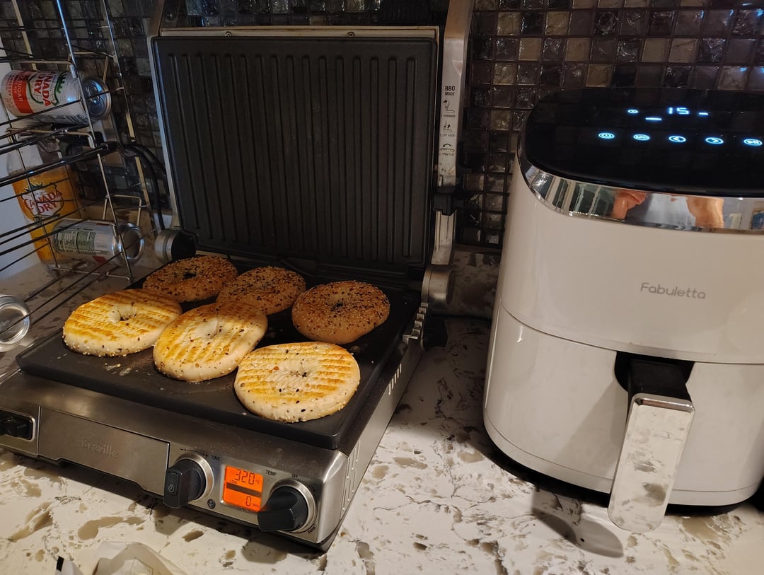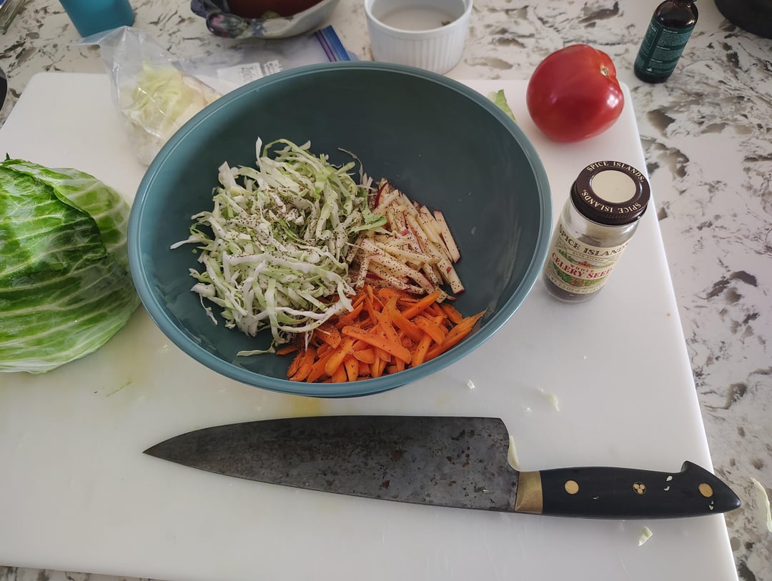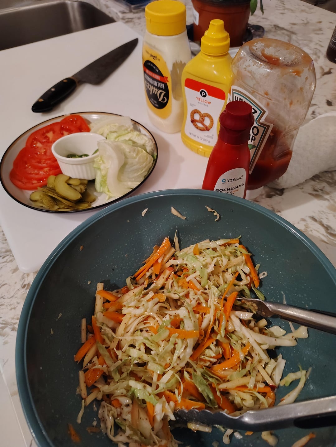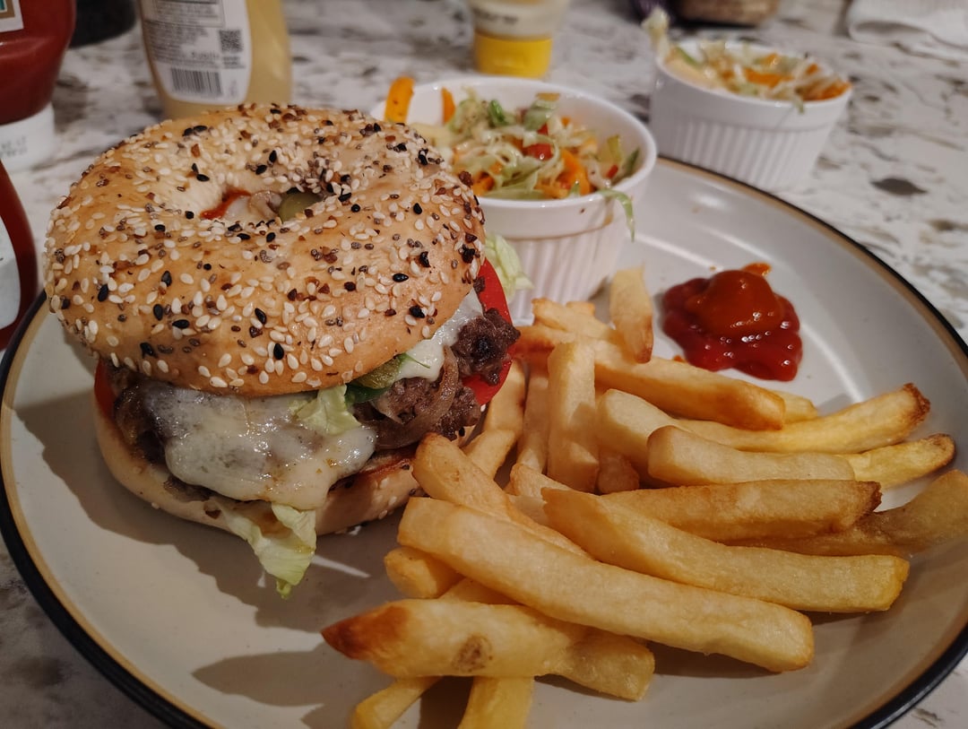 Oklahoma burger on an everything bagel with celery apple slaw and frozen ass cheap fries (with details because burger mis en place is satisfying) by PinchedTazerZ0 Dinner Tonight Tonight's Dinner