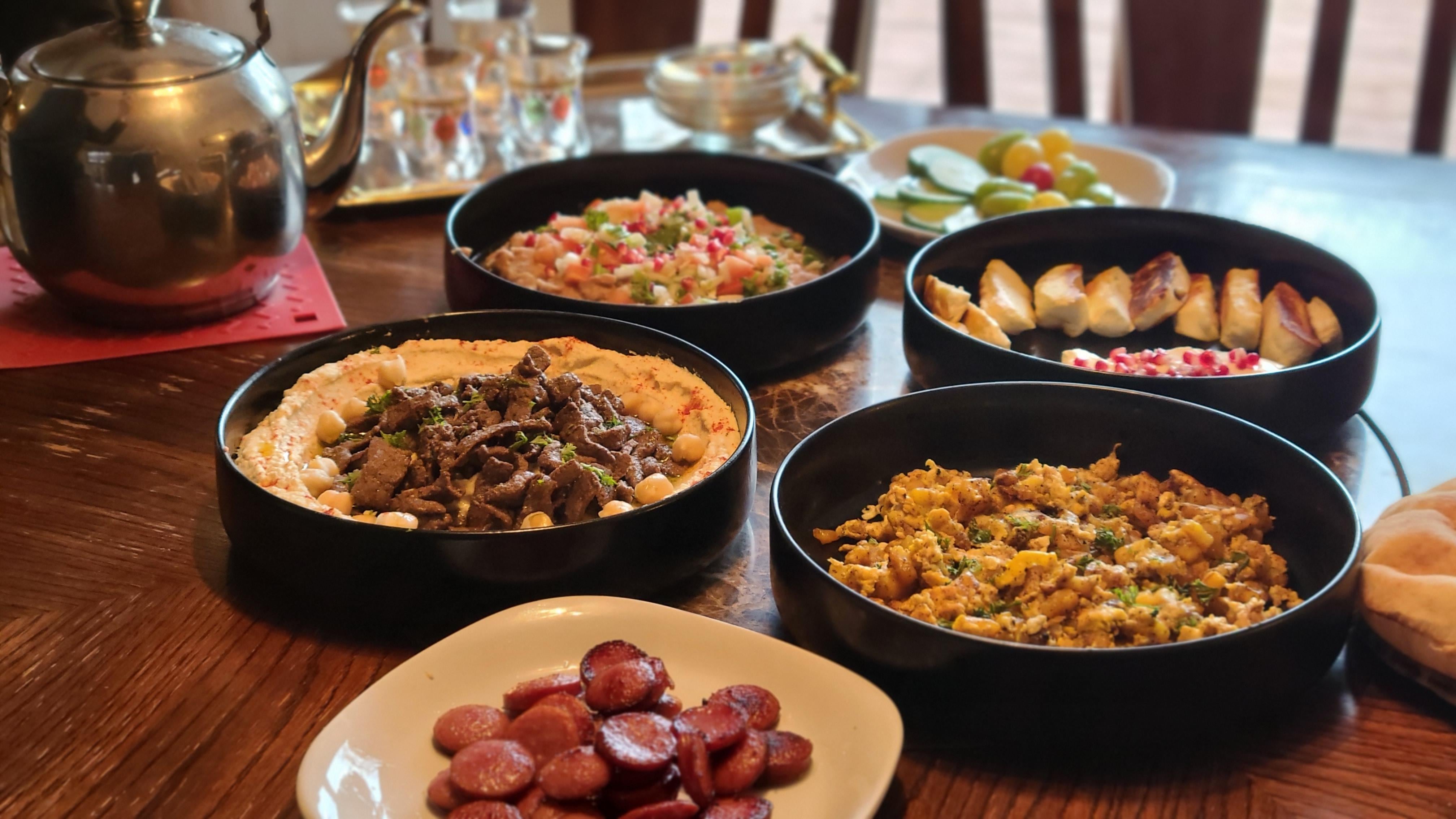 [Homemade] Simple middle eastern breakfast, some hummus, Full, haloumi, scrambled eggs and potatoes, and fried beef sausage, with tea.