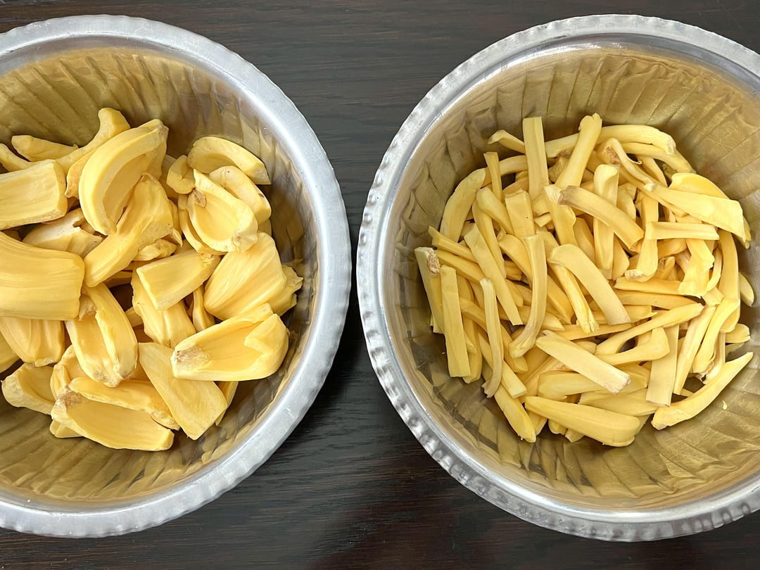 Step 2 – separate jackfruit pods from the fruit and remove the seeds from the pods. Each fruit pod contains a seed, the size of a large almond. Boil the seeds for about 5 to 8 minutes. Let cool and peel the outermost skin. The peeled seeds are now edible. Set them aside.