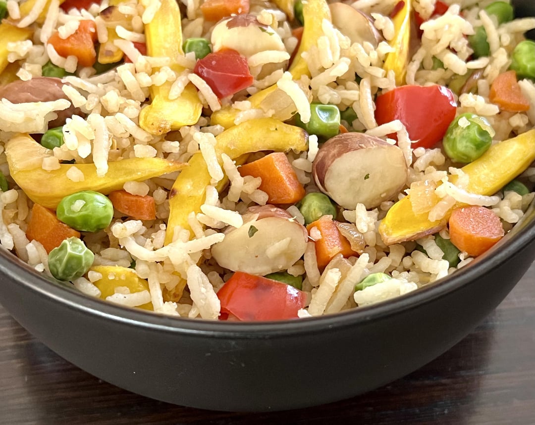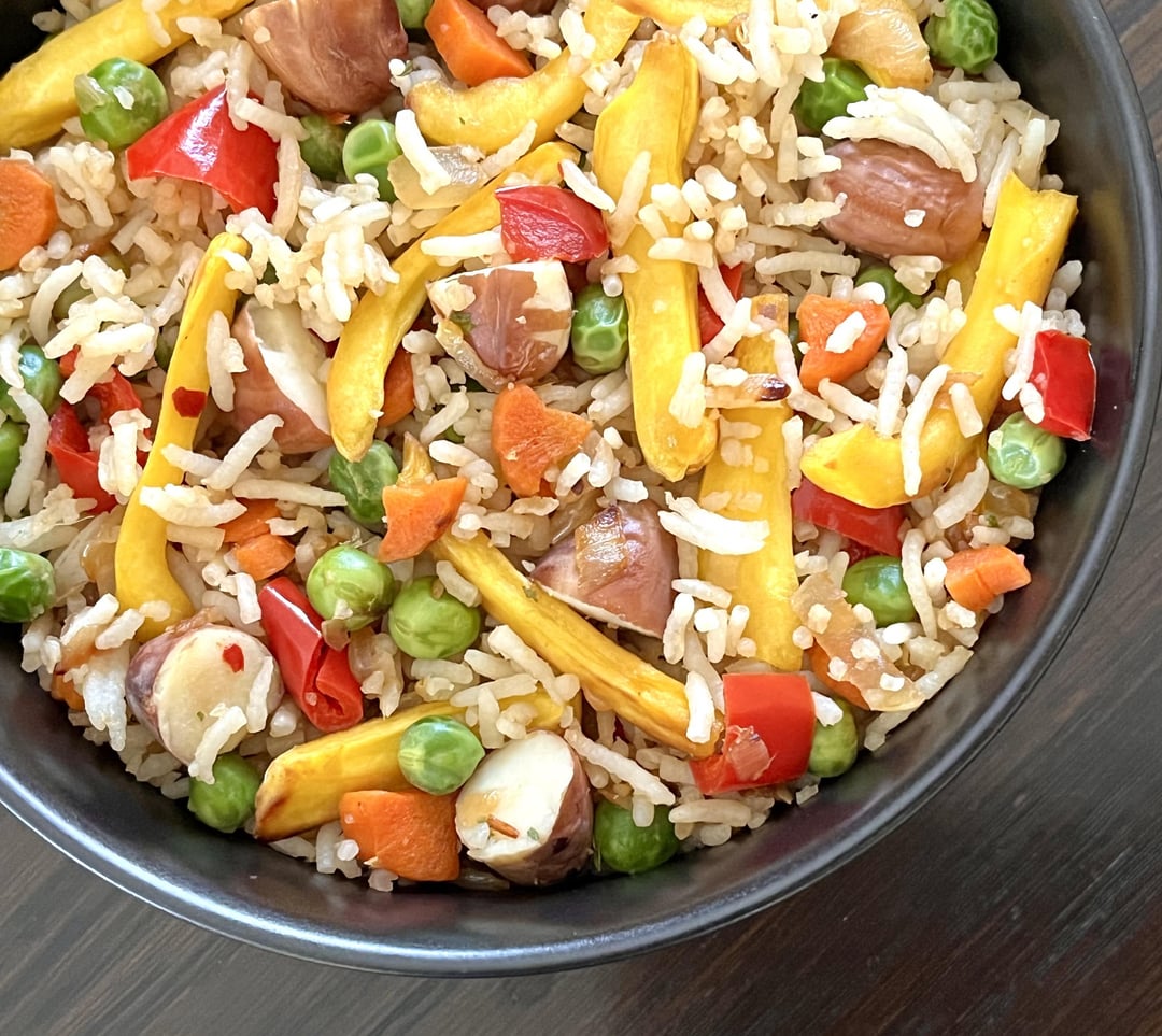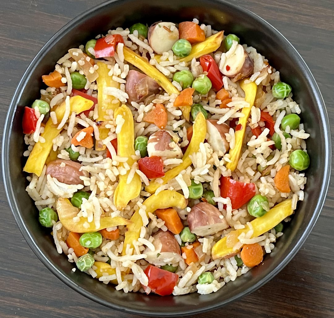 1 cup Basmati or Jasmine rice, 1 medium onion, 1 tablespoon sesame cooking oil, 2 carrots peeled and chopped, 4 mini red sweet peppers chopped, 4 to 5 fresh jackfruit pods chopped, 1/3 cup frozen green peas, 3 cloves of fresh garlic finely minced, half teaspoon finely minced fresh ginger, 2 tablespoons soy sauce, 1 teaspoon crushed red pepper, half teaspoon ground black pepper, 2 teaspoons lemon juice.