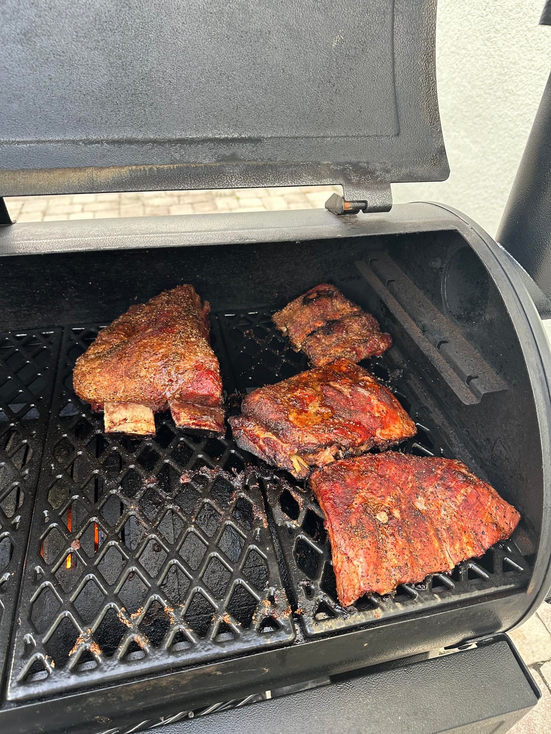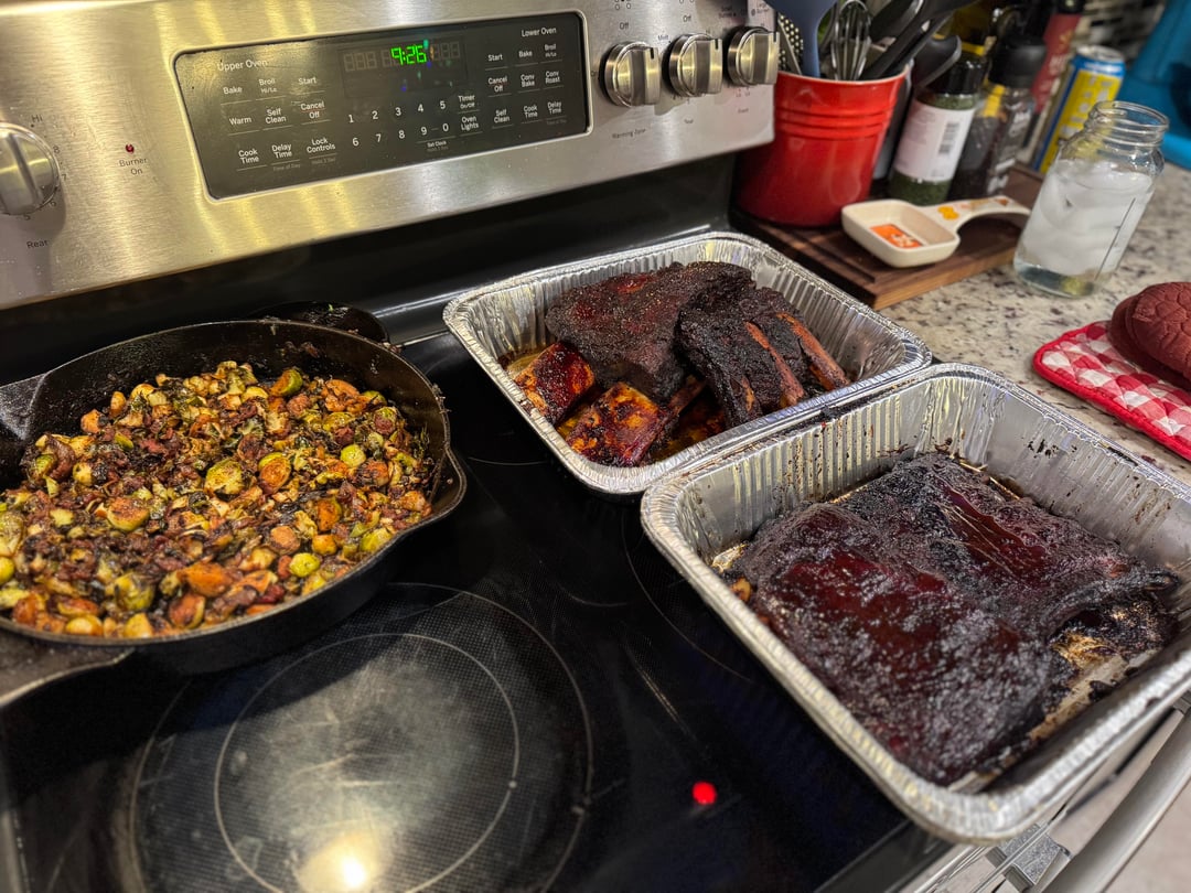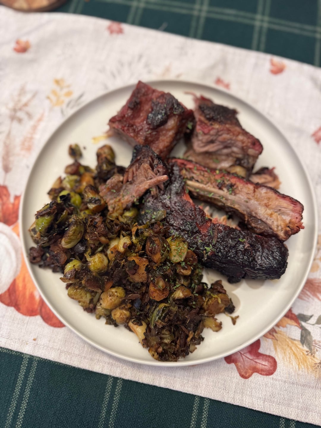 First three photos are from our BBQ night- while fiancé was at work I fired up my smoker and put on a rack of St. Louis Ribs, 3 small beef back ribs from some ribeyes that we ate, and 2 beef plate ribs that had been in our freezer for 2 months. Served with maple-bacon brussels sprouts and it was incredible. We definitely are going to start doing more date nights with BBQ since we have gotten some patio furniture now. It was amazing!! 🩷