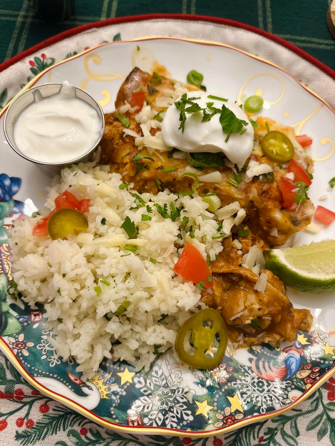 Fifth picture is chicken enchiladas – these were super good but I made a bit too much and had to waste some food which made me sad! I cooked up some chicken with taco seasonings, shredded and mixed it with a can of Green Chilies, cilantro, cheese, and a mix of caramelized onions and bell pepper. I make my own tomato-based enchilada sauce and use whole wheat tortillas. It was really yummy.