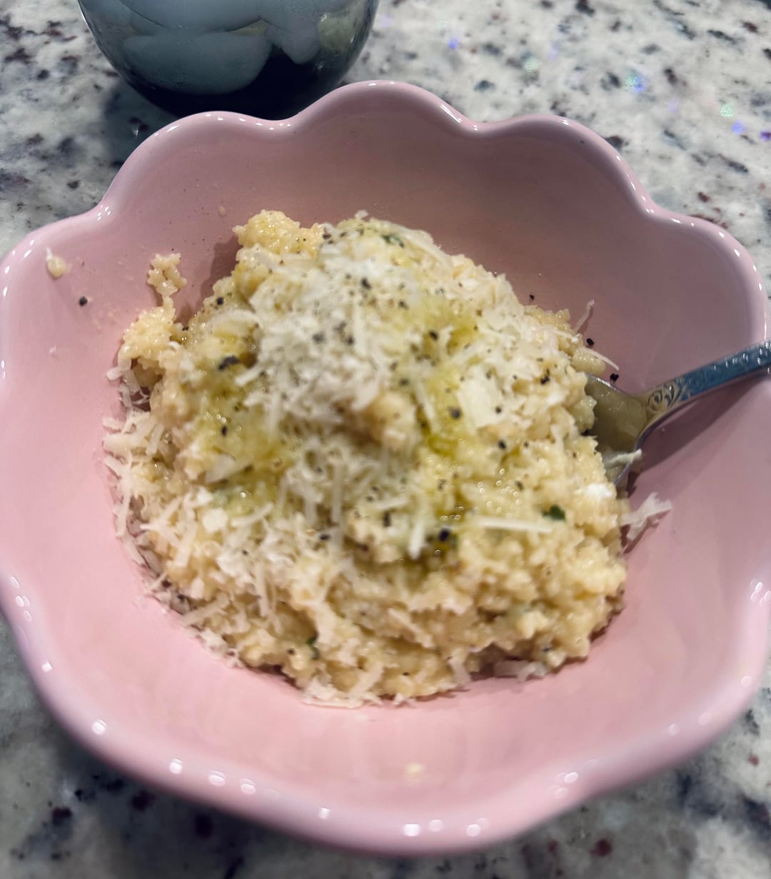 Seventh meal is from a day where I was super sick! I made myself pastina with chicken stock, an egg, and parmesan cheese and it cured my body and soul. I love this when I don’t feel my best 💙
