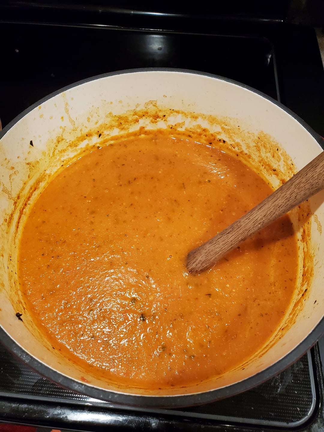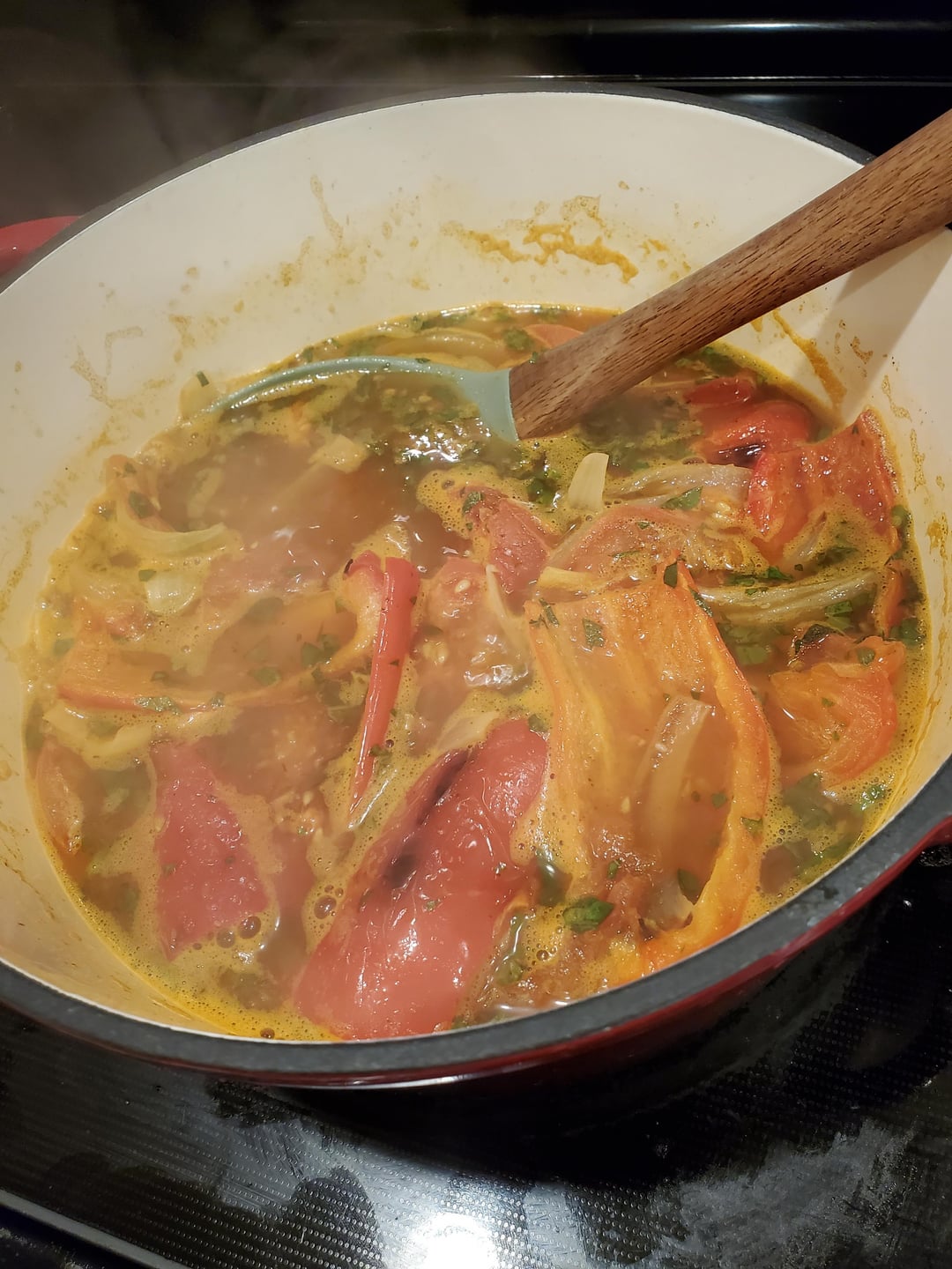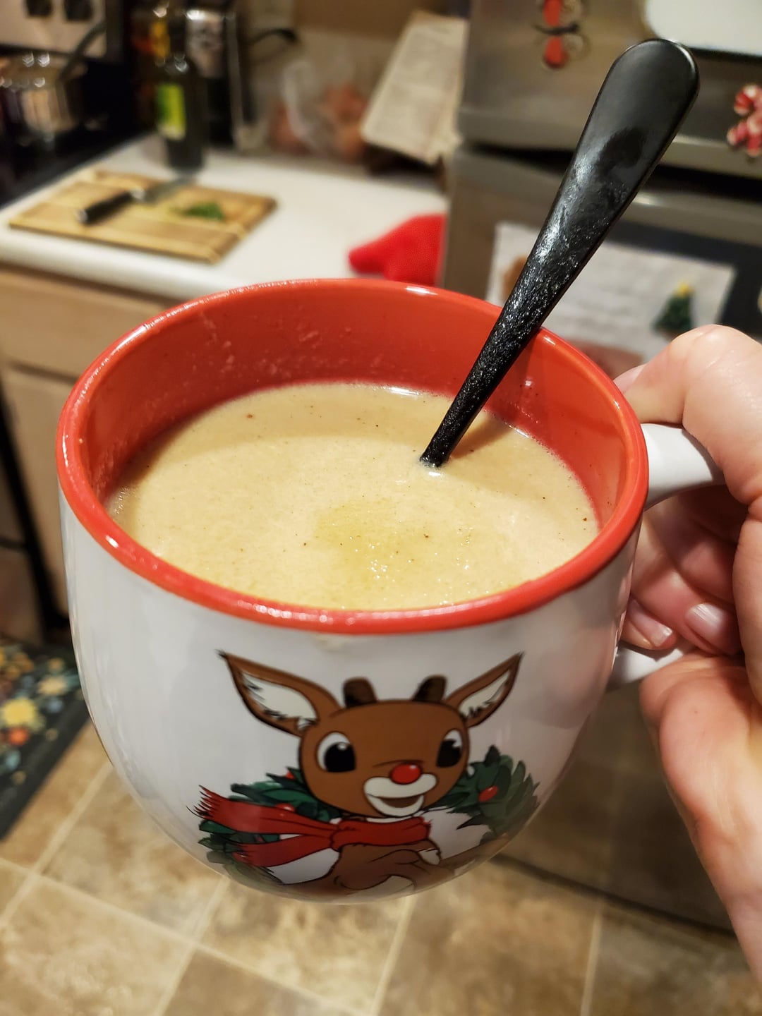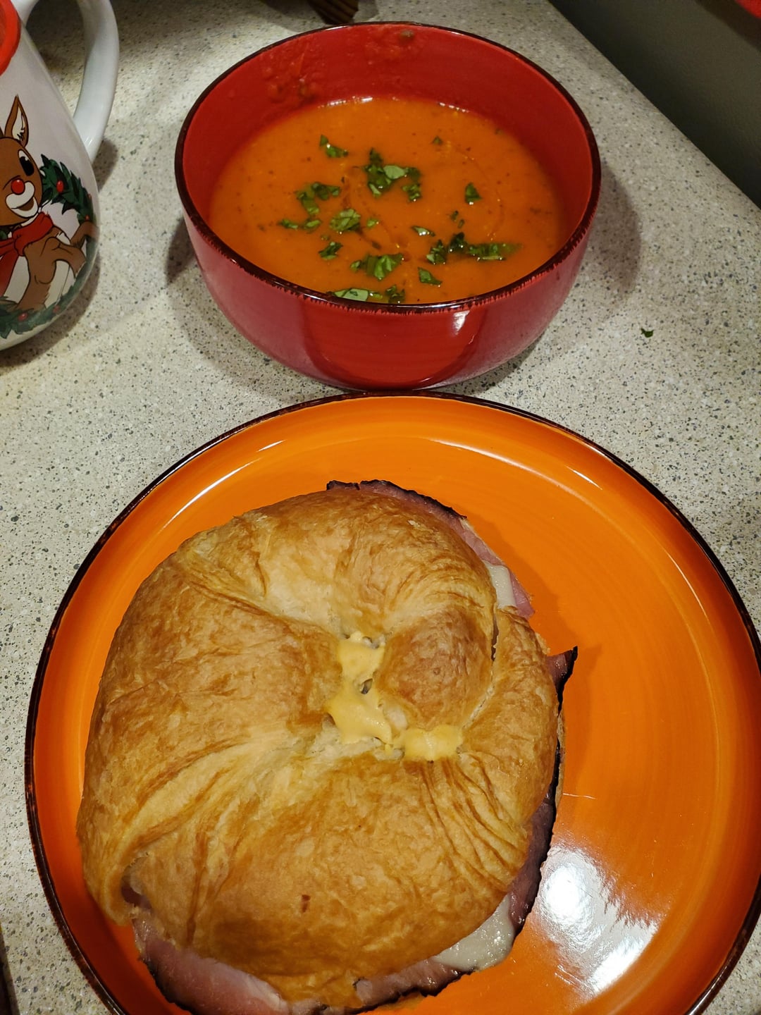 Roasted tomato and red pepper soup with sandwiches made from leftover ham, Swiss cheese, and Dijon mustard toasted in a croissant (bonus cup of home-made eggnog)