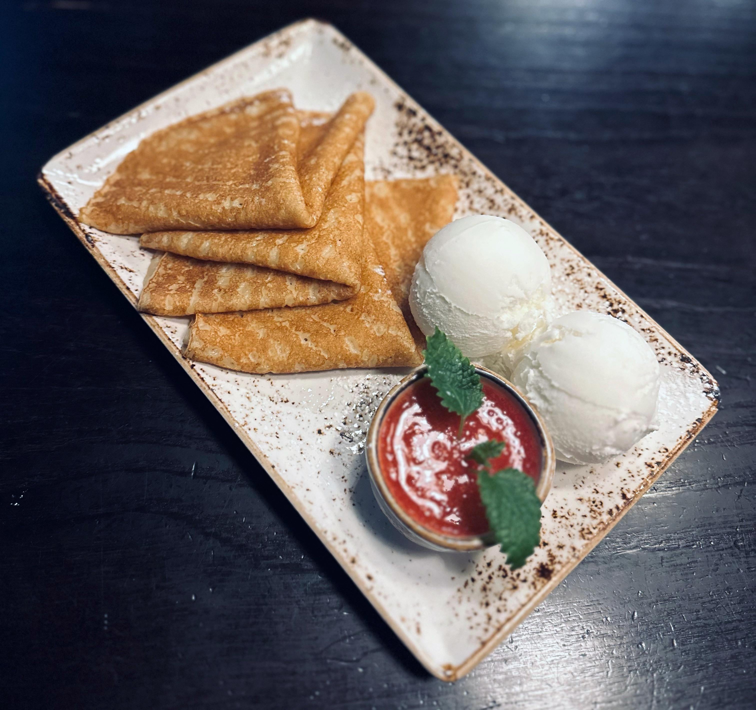 [I ate] Pancakes with strawberry jam and vanilla ice cream
