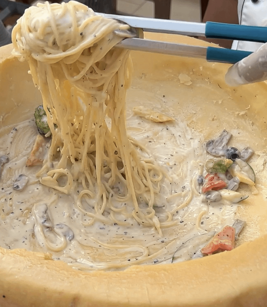This is the video of the truffle pasta with flaming cognac done in the Parmesan wheel. I had that at LaPetite Paris in Los Angeles and it was probably the most life-changing dish I’ve ever had.