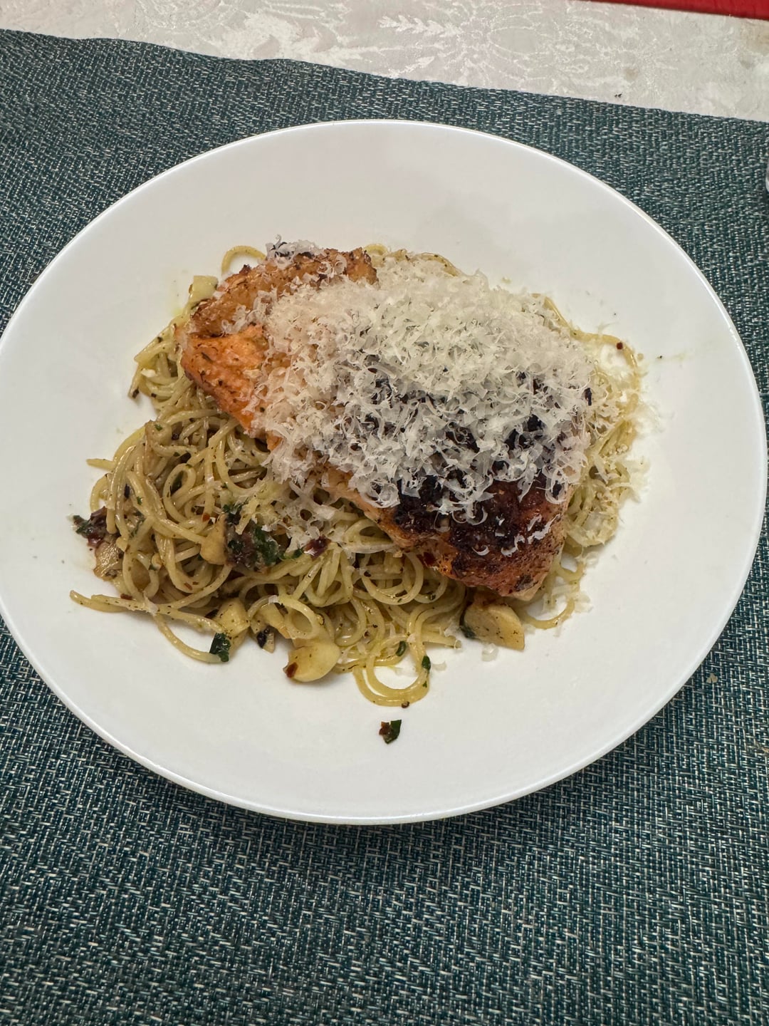 6- Seared Salmon over Spaghetti Aglio e Olio