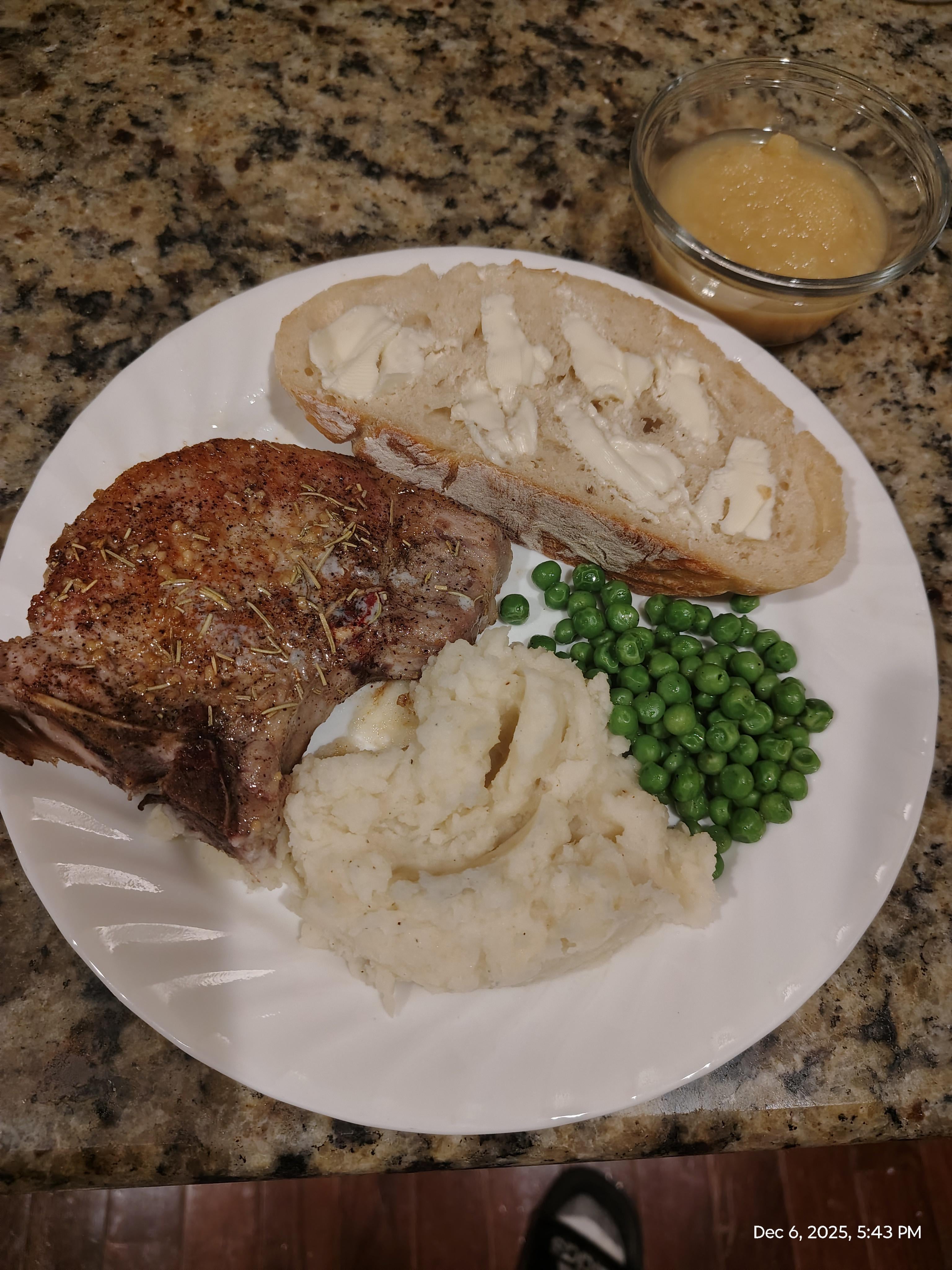 Mashed potatoes, peas, cast iron fried pork chop with rosemary n garlic n homemade bread and a side of apple sauce. by Most_Talk_2067 Dinner Tonight Tonight's Dinner