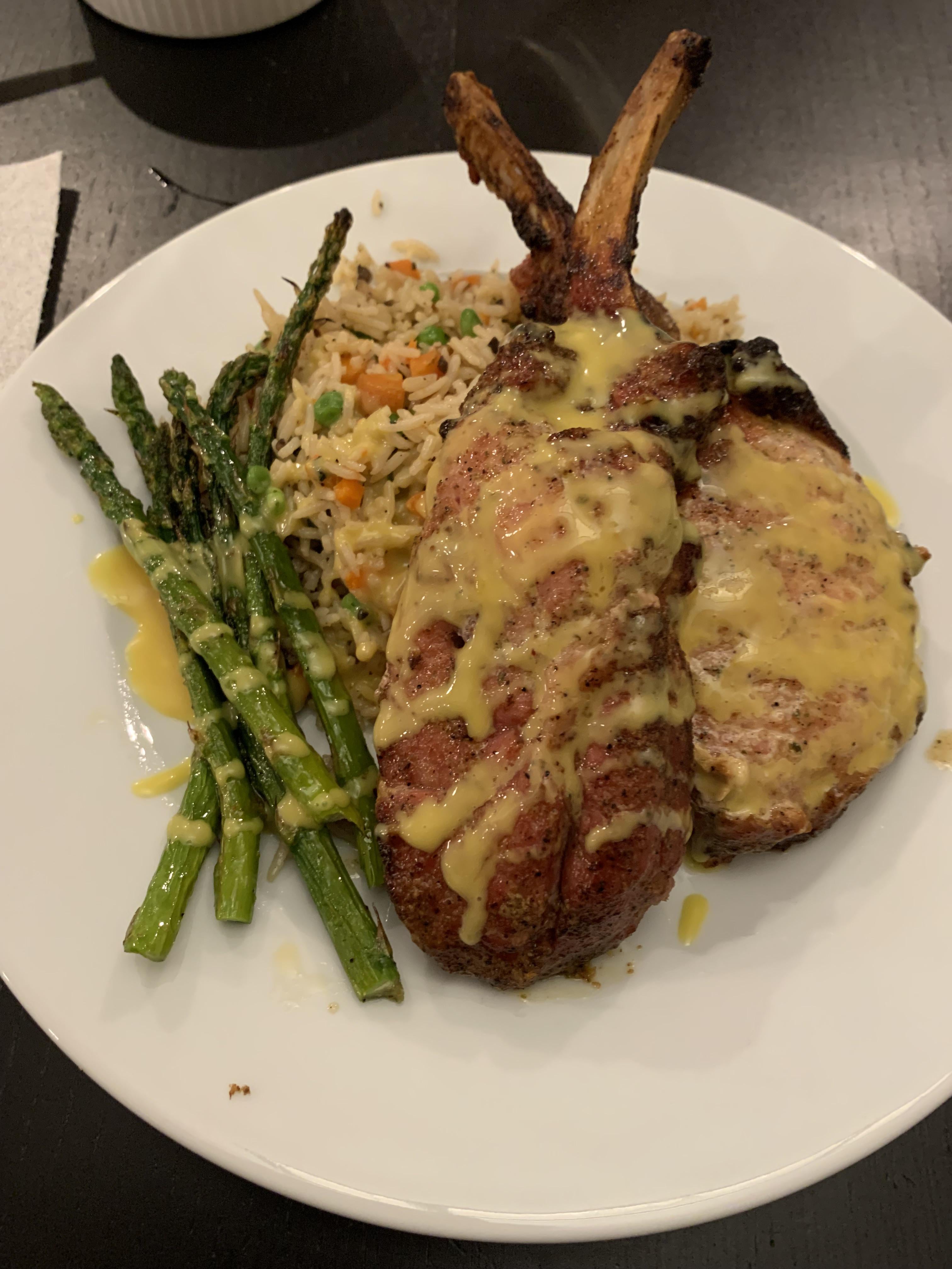 Smoked rack of pork with honey mustard glaze, charred asparagus, rice pilaf by mcgargargar Dinner Tonight Tonight's Dinner