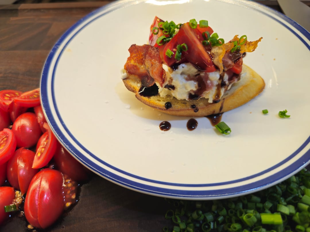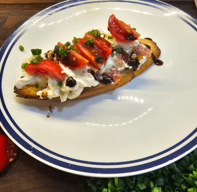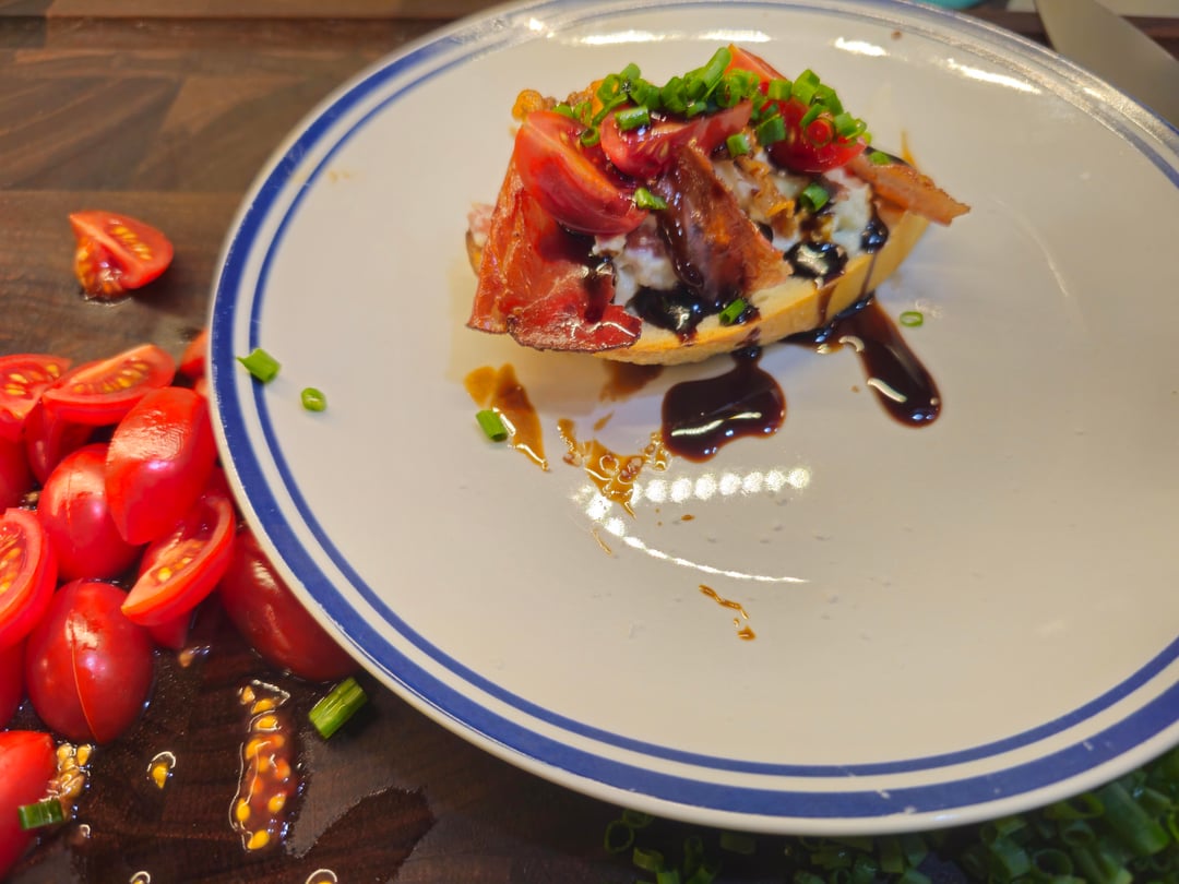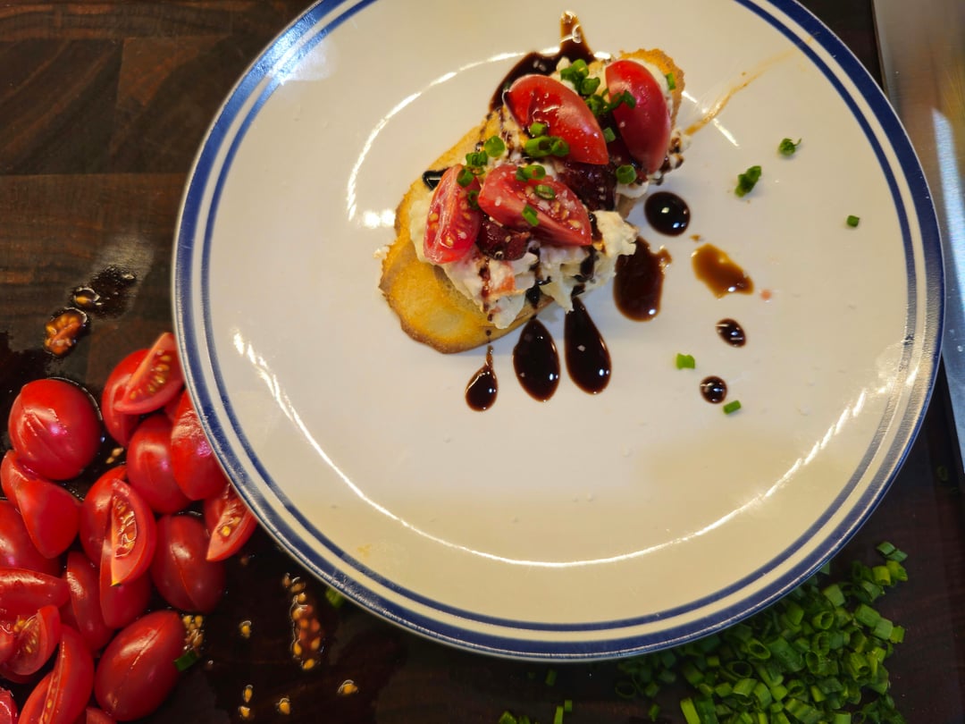 smelly-dorothy on December 8, 2025 1:03 am Sliced French bread convection-baked at 400°F. Burrata with salt, pepper, pan-fried speck, and truffle oil. Topped with quartered salad tomatoes, balsamic vinegar reduction, and chives.