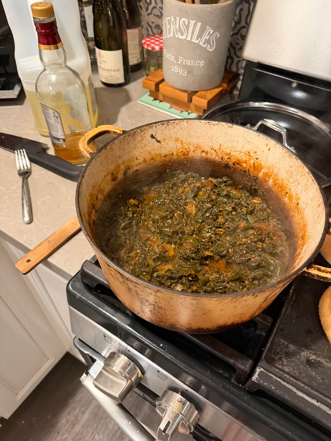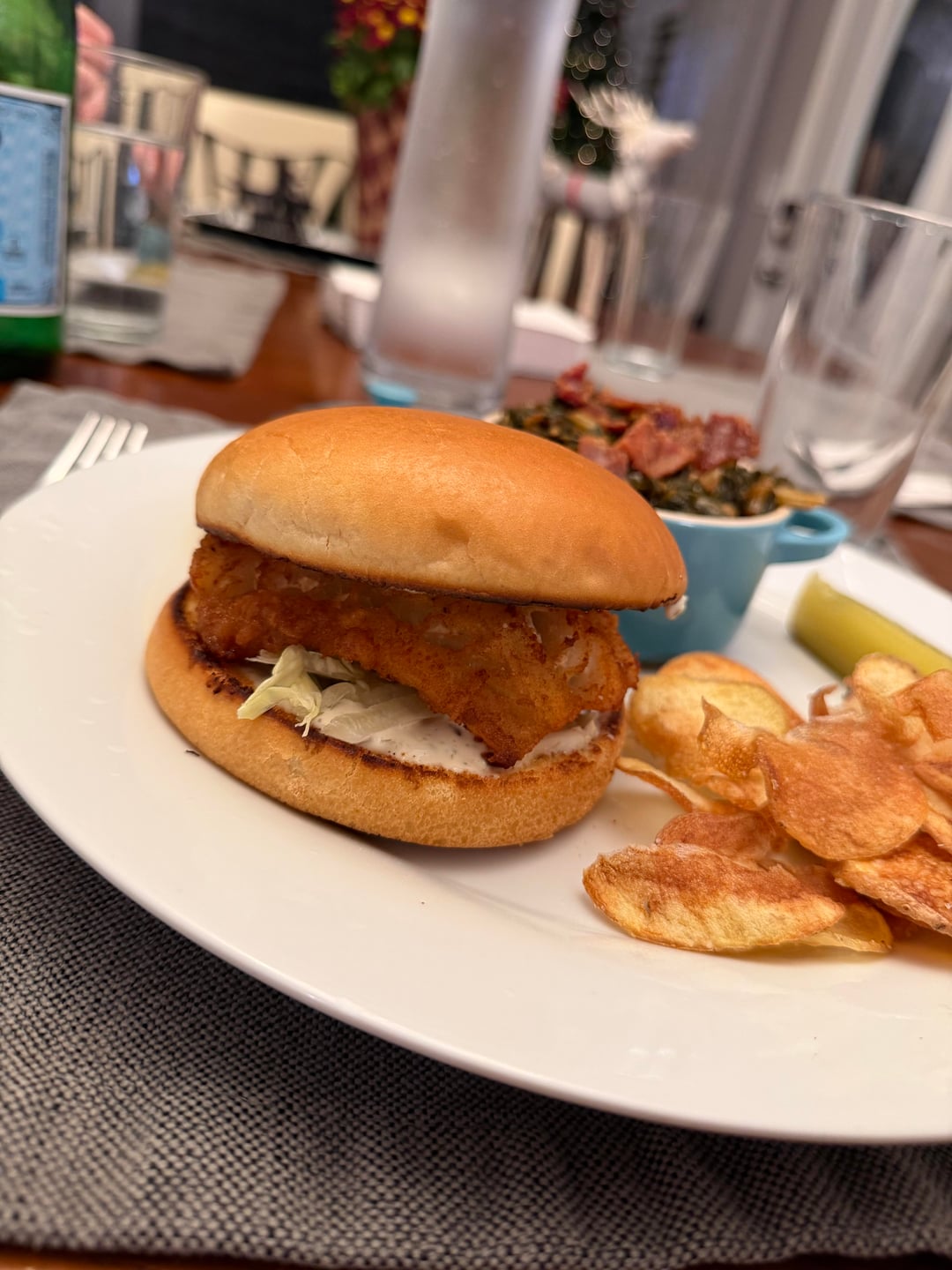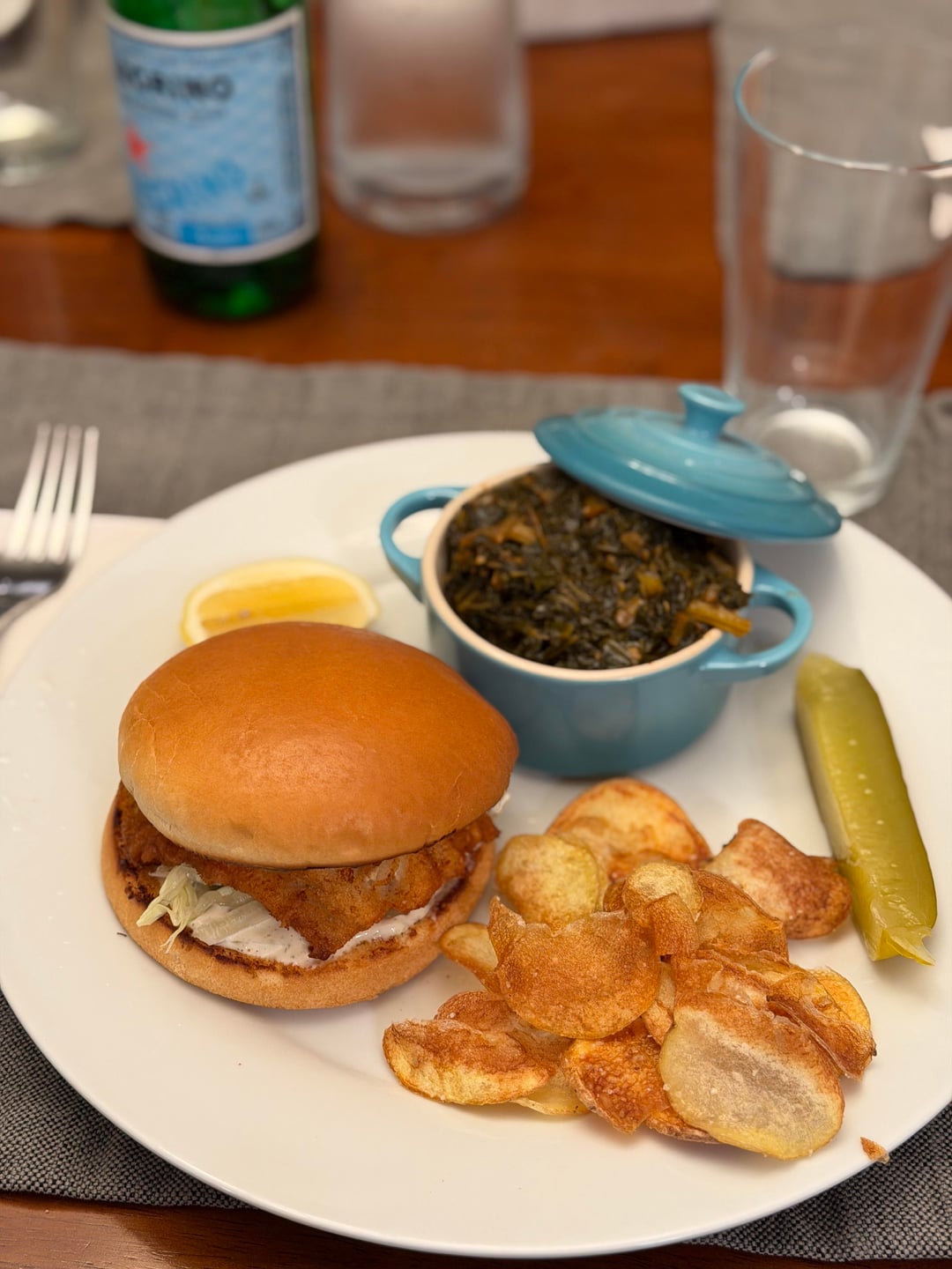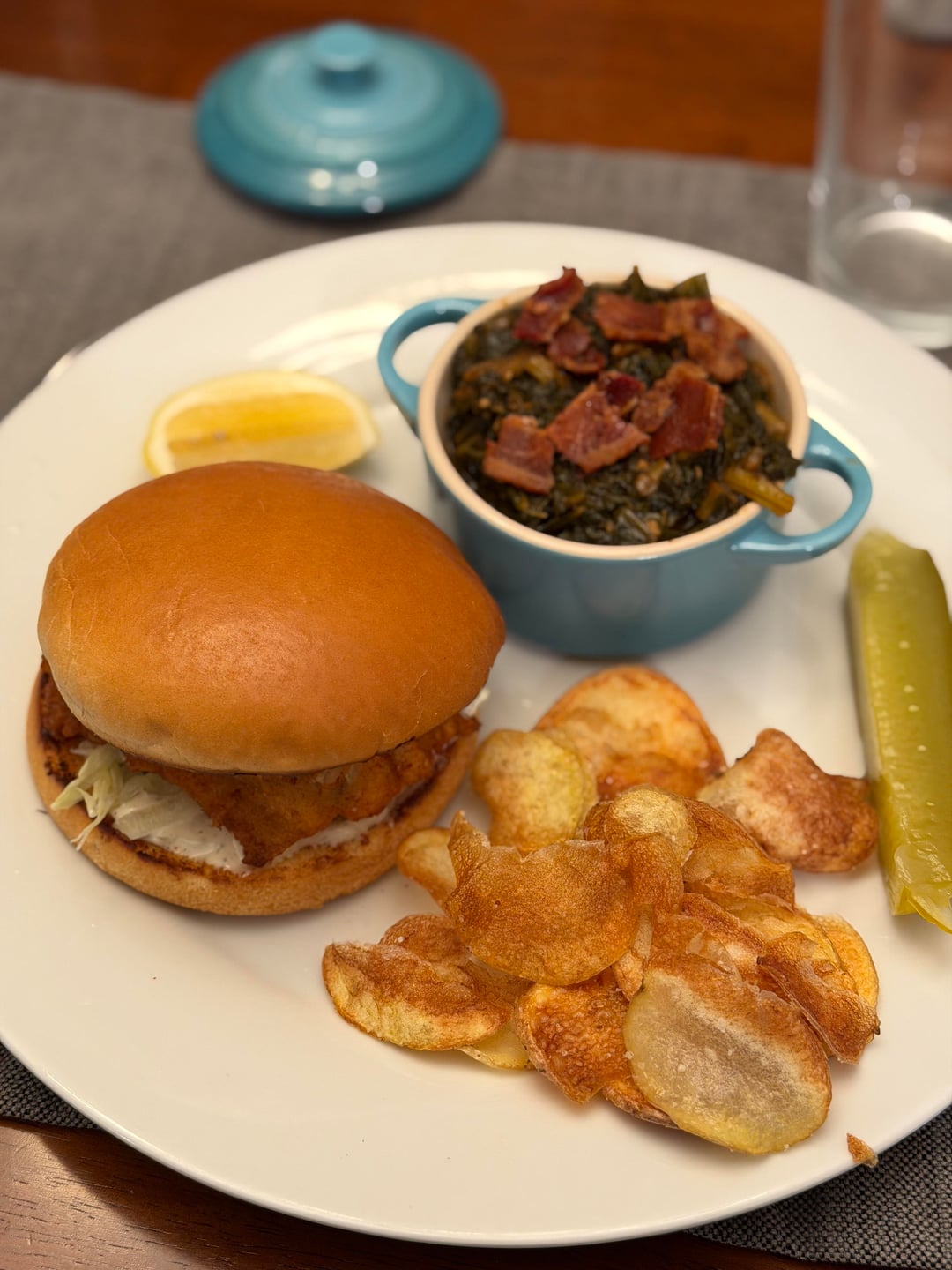 [homemade] Beer battered fried cod sandwiches, homemade tartar sauce, homemade potatoe chips, braised collard greens, pickle. by PhilosophersPants Food