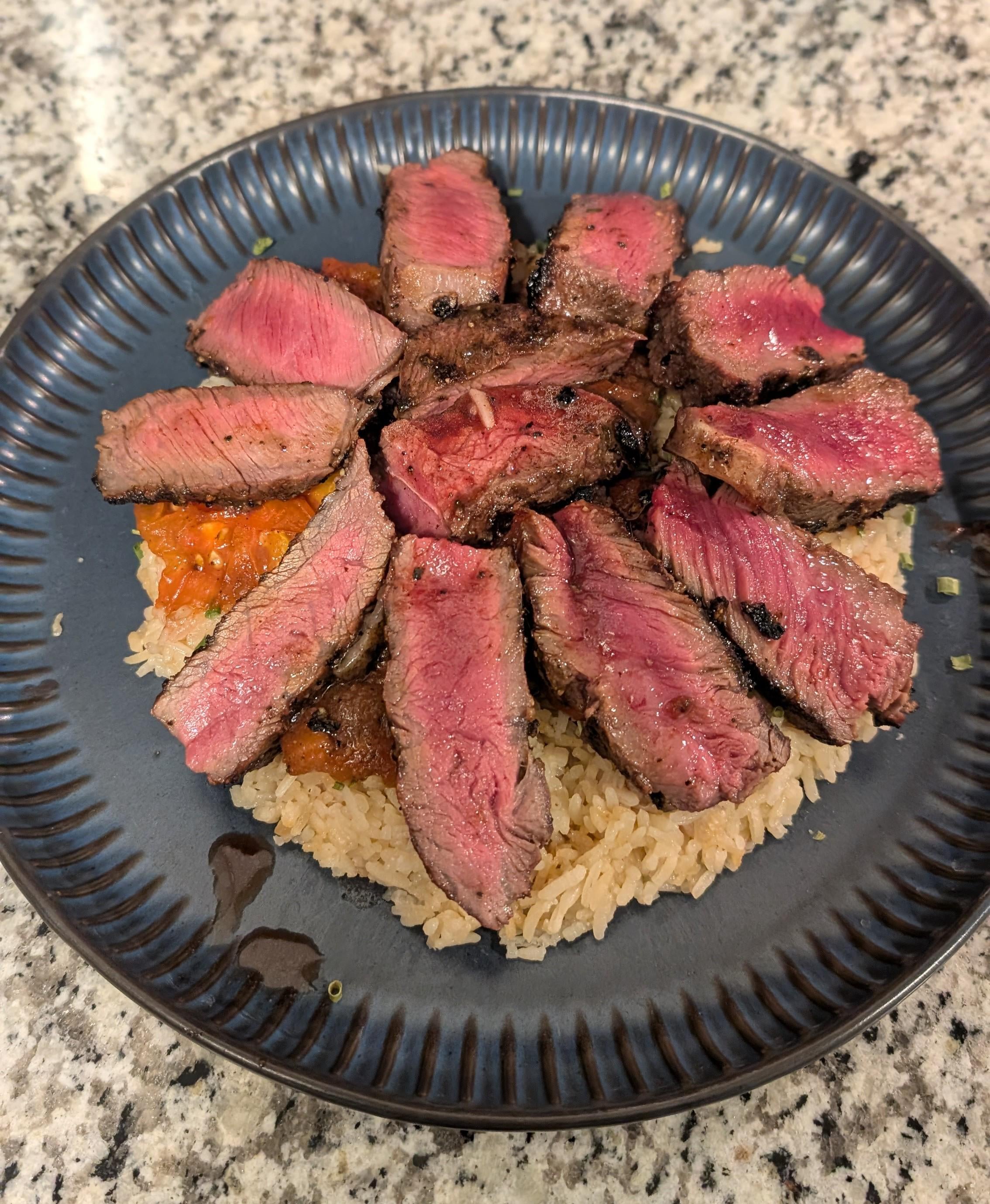 [Homemade] Grilled ribeye & Beefsteak tomatoes over beef broth rice.