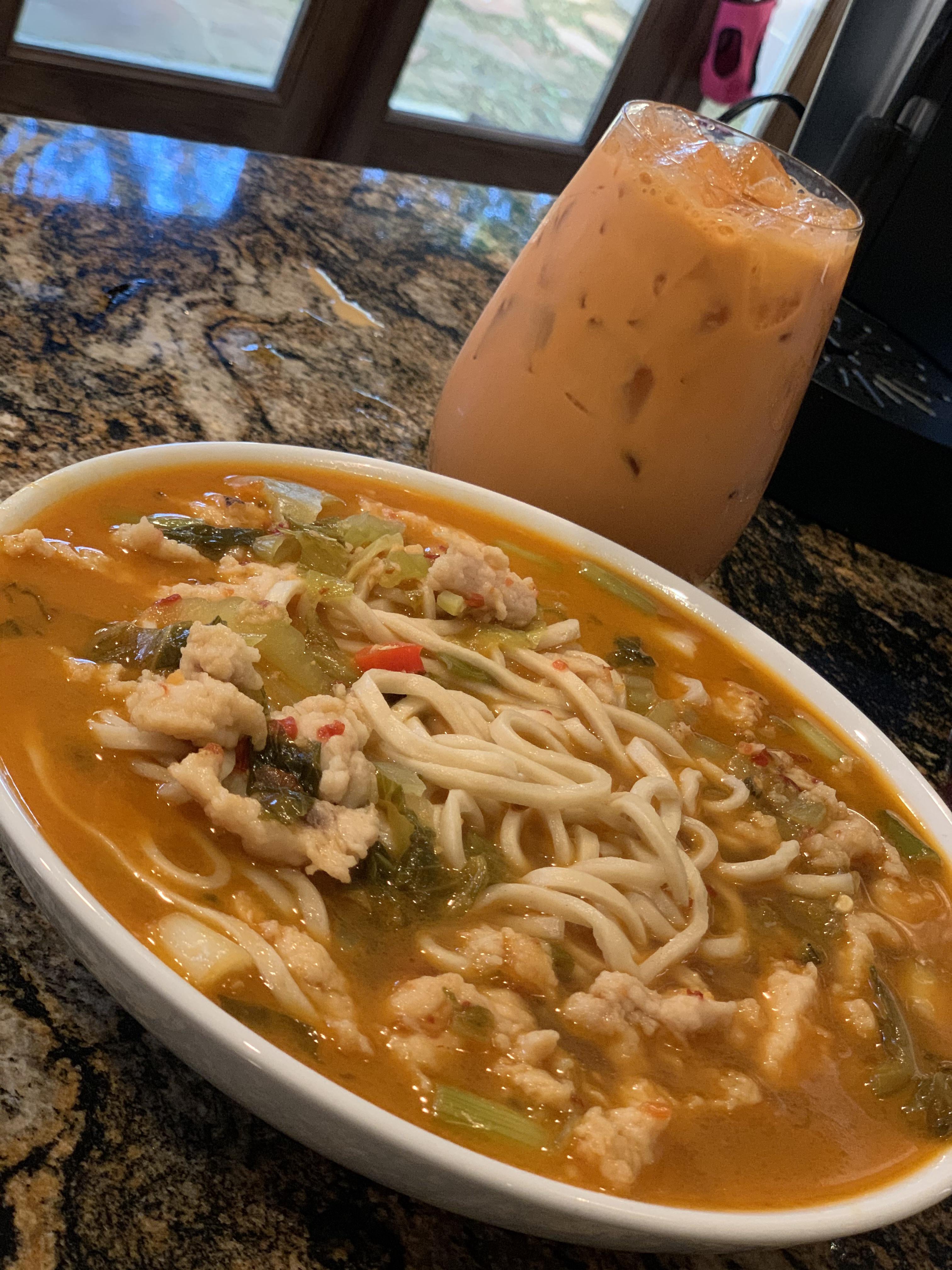 Chicken, noodles, and a broth infused with garlic, peppers, ginger, lemongrass, red curry, cilantro, and coconut milk. Spicy level 7 out of 10. by dentalexaminer Food