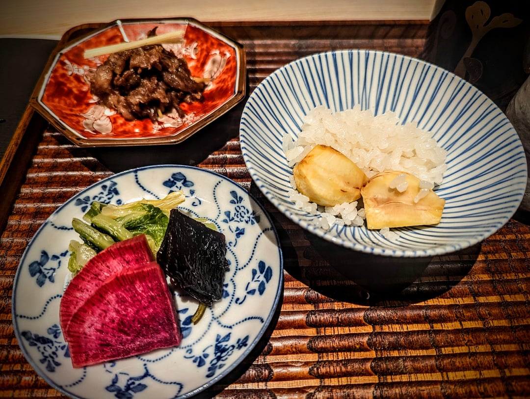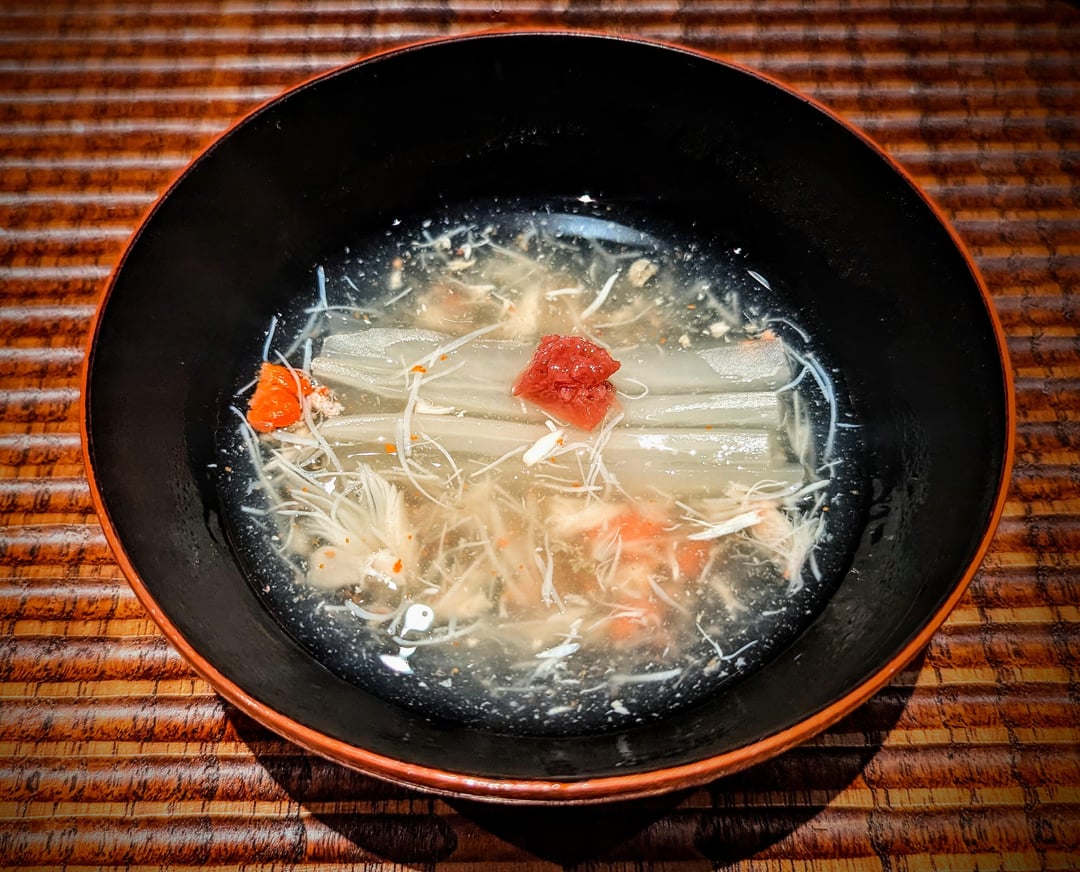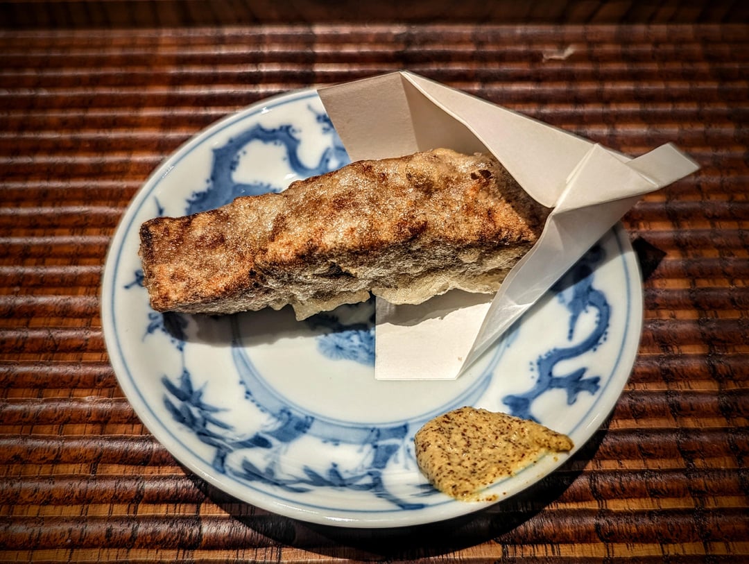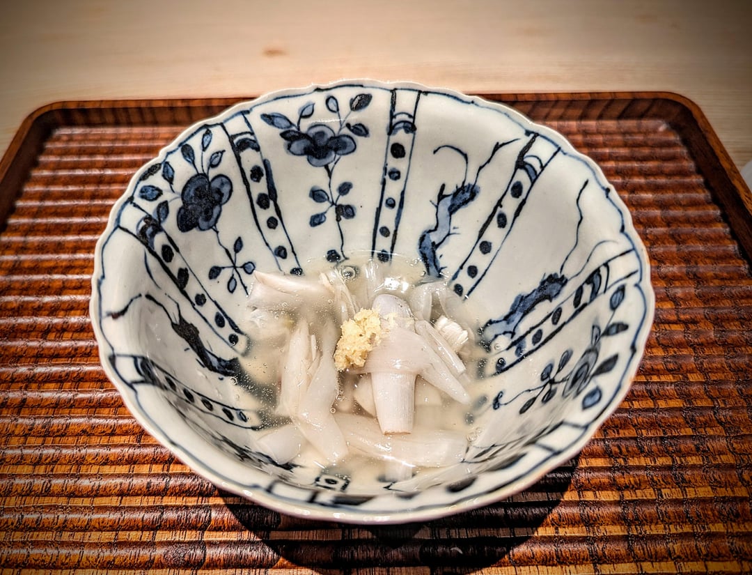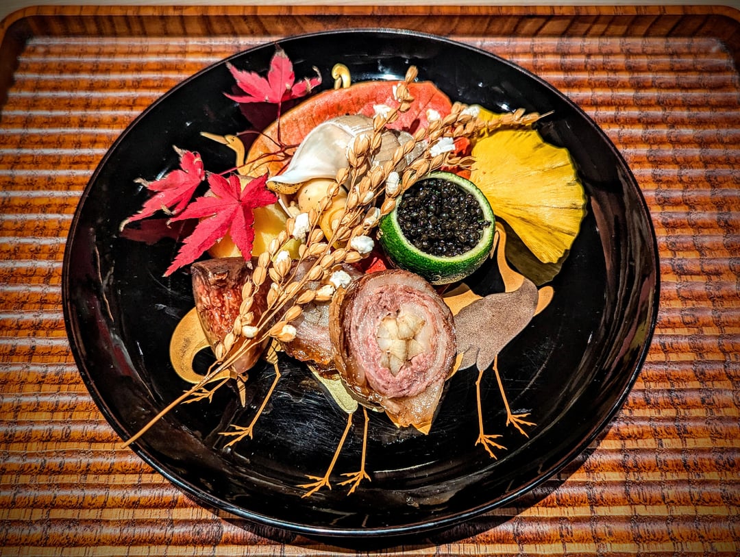 The seasonal appetizers may not have been much to write home about – the hassun comprising caviar, a beef roulade and fig – but the beef and sea urchin sashimi, served with a dab of wasabi and set upon a shallow pool of soy sauce, was the real start to the meal; fatty meat complemented by creamy, cool uni, and a hint of spice from the wasabi, made for a luxurious beginning.