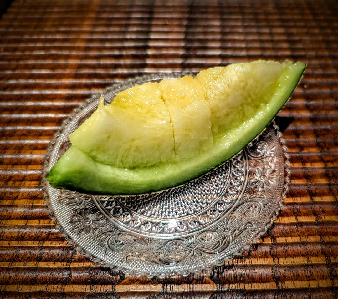 The braised taro stems brought things down the hill with gentler flavours, before the tataki moved things back up a notch, with the soy sauce and wasabi once again being accompaniments to the beef tataki, though with the soy sauce now strewn through with green onion, and salt on the side to bring out the rich flavour of the meat. A soup of female snow crab followed, the flaky meat sitting in a clear broth that was vegetal and only sparingly salted. At this point, I was quite enjoying the alternating "rich beef dish followed by softer seasonal dish" menu, though it would be deceitful to suggest that the two types of dishes were on par – the beef dishes were clearly favoured, not just by myself but also by the other diners (Nikuya Tanaka Ginza's main room counter seats nine, and it was a full-house the night that I dined). Propitious, as what followed was all beef, until the dessert. The beef tenderloin tempura (thick and piping hot, with the tender interior nicely juxtaposing the crispy shell) and beautifully marbled, thinly sliced sirloin "shabu shabu" followed, and were the two highlights of the savoury courses, the latter in particular having a gorgeous melt-in-the-mouth quality that was not bettered all evening. The tenderloin steak, cooked over a binchotan grill, was succulent with a great sear (though eclipsed by the tenderloin offered at Ginza Kitagawa a few days before), and the chestnut rice with beef sukiyaki was a pleasant (if not greatly inspiring) end to the savoury courses. For dessert, Japanese musk melon, which blew me away with how sweet, soft and syrupy it was. Who knew that the highlight of an outing to a wagyu kappo restaurant would be a slice of melon?