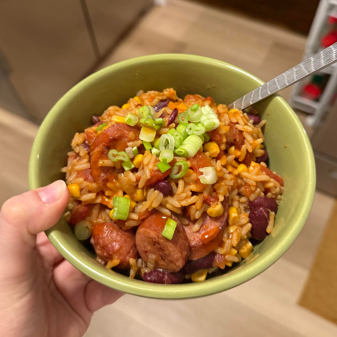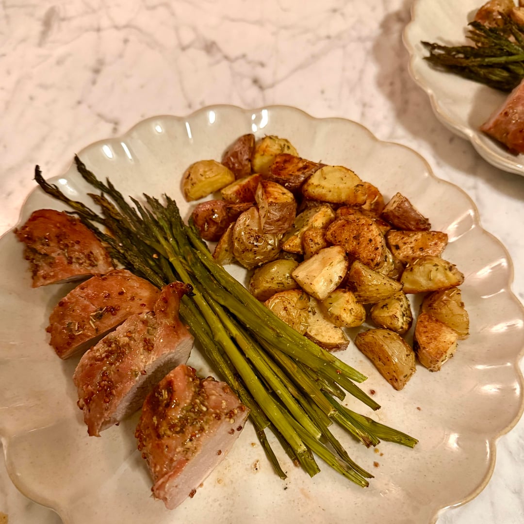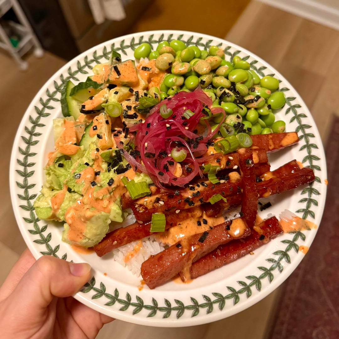 1. Roasted pork loin with asparagus and potatoes, fried spam poke bowl, cheater’s jambalaya (no shrimp since I’m allergic)