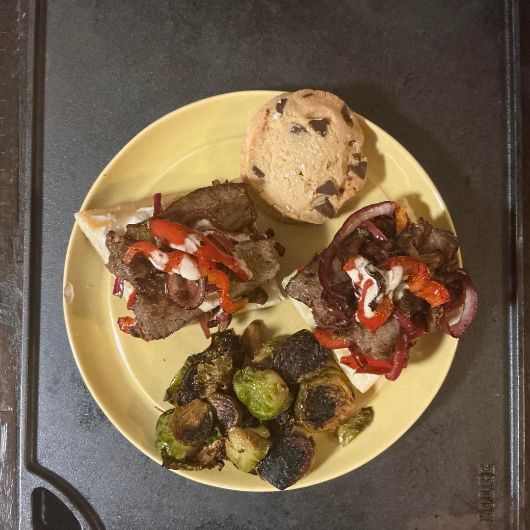 Open-faced steak sandwich w/double cooked brussels sprouts & chocolate chip shortbread cookie
