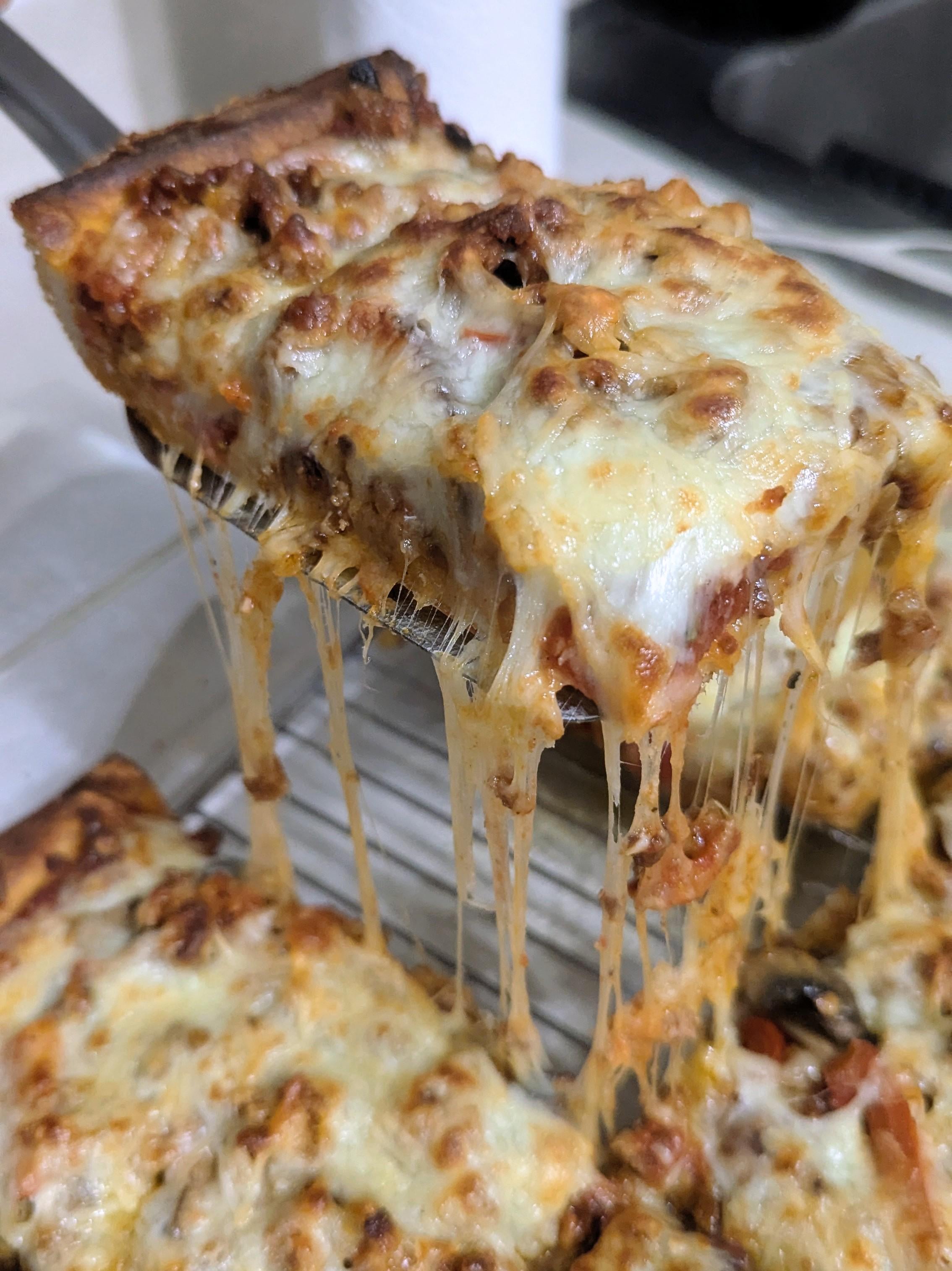 Sausage mushroom pizza with caramelized onion and bell pepper.