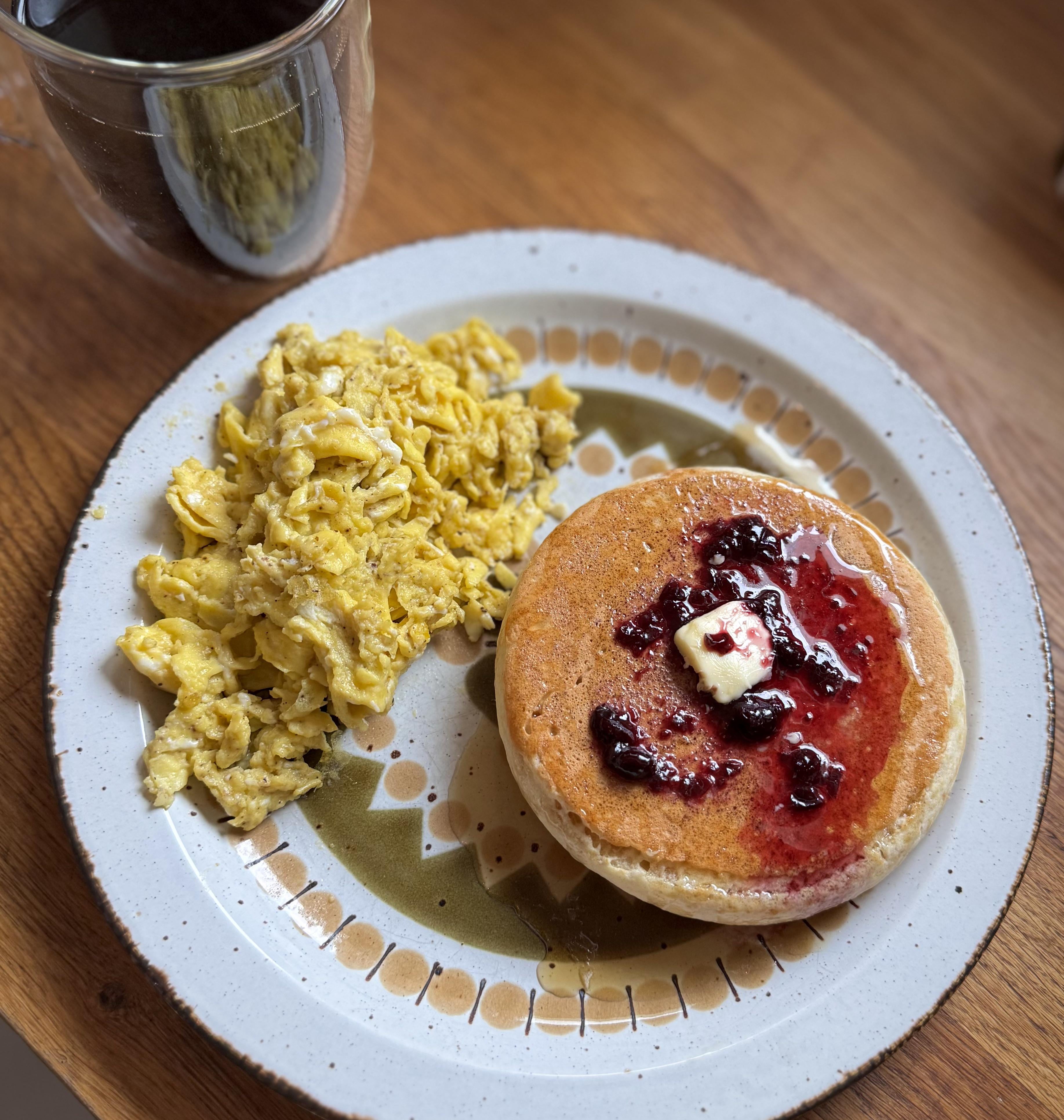 Added pancake batter to a cast iron skillet with no butter or oil and fried it on low/medium heat. Added homemade haskap berry jam on top with butter and maple syrup.