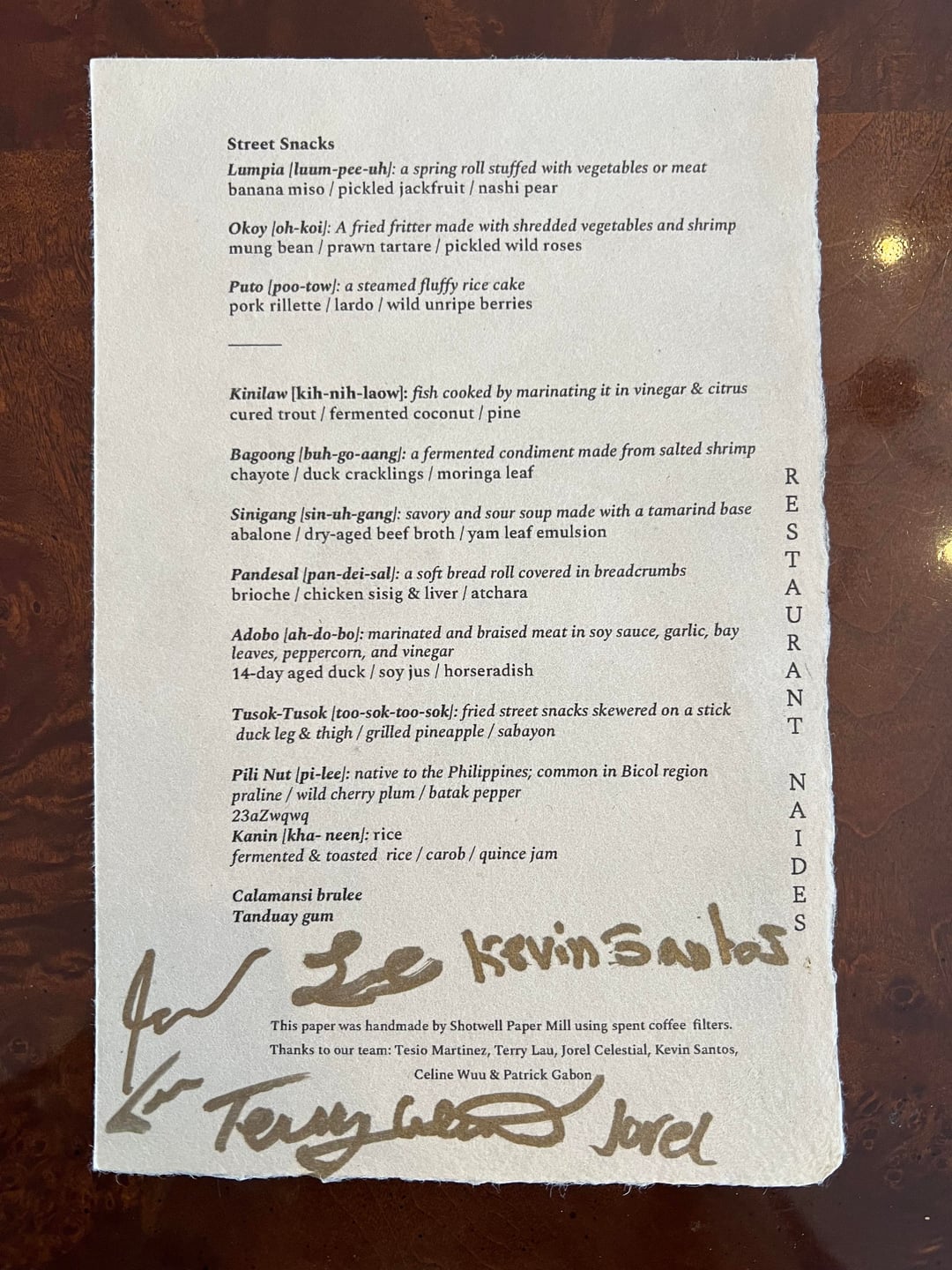 My partner and I managed to land a reservation at Restaurant Naides on opening weekend and it was the best meal we have had all year. This is a new fine dining Filipino restaurant in the former Sons and Daughters location. Highlights for me were the tusok-tusok, sinigang, and the pandesal. There were absolutely no misses.