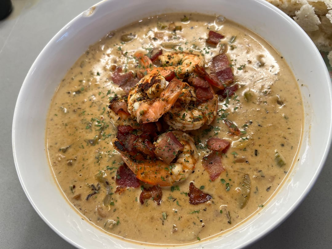I made a cajun clam chowder with grilled shrimp and bacon on top. It was pretty delicious. Lemon rosemary bread to dip. The chip on the bowl is the only imperfection lol Would you guys ever order this? by BlackLaraCroft Food