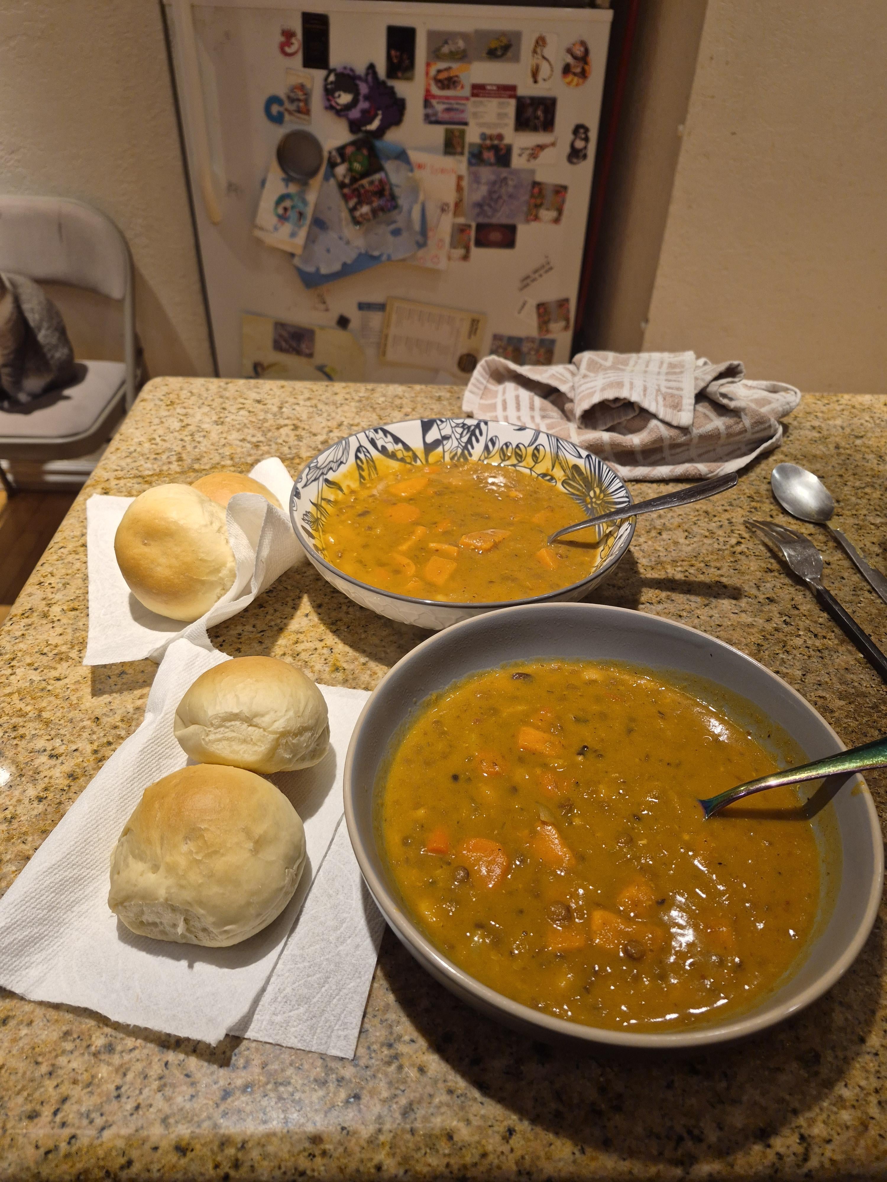 Oops I got off off work and decided I wanted a multi bean soup and fresh bread. Lol it’s soooo good. I added a yam and some carrots too. I over kneaded the bread hut it still came out great.