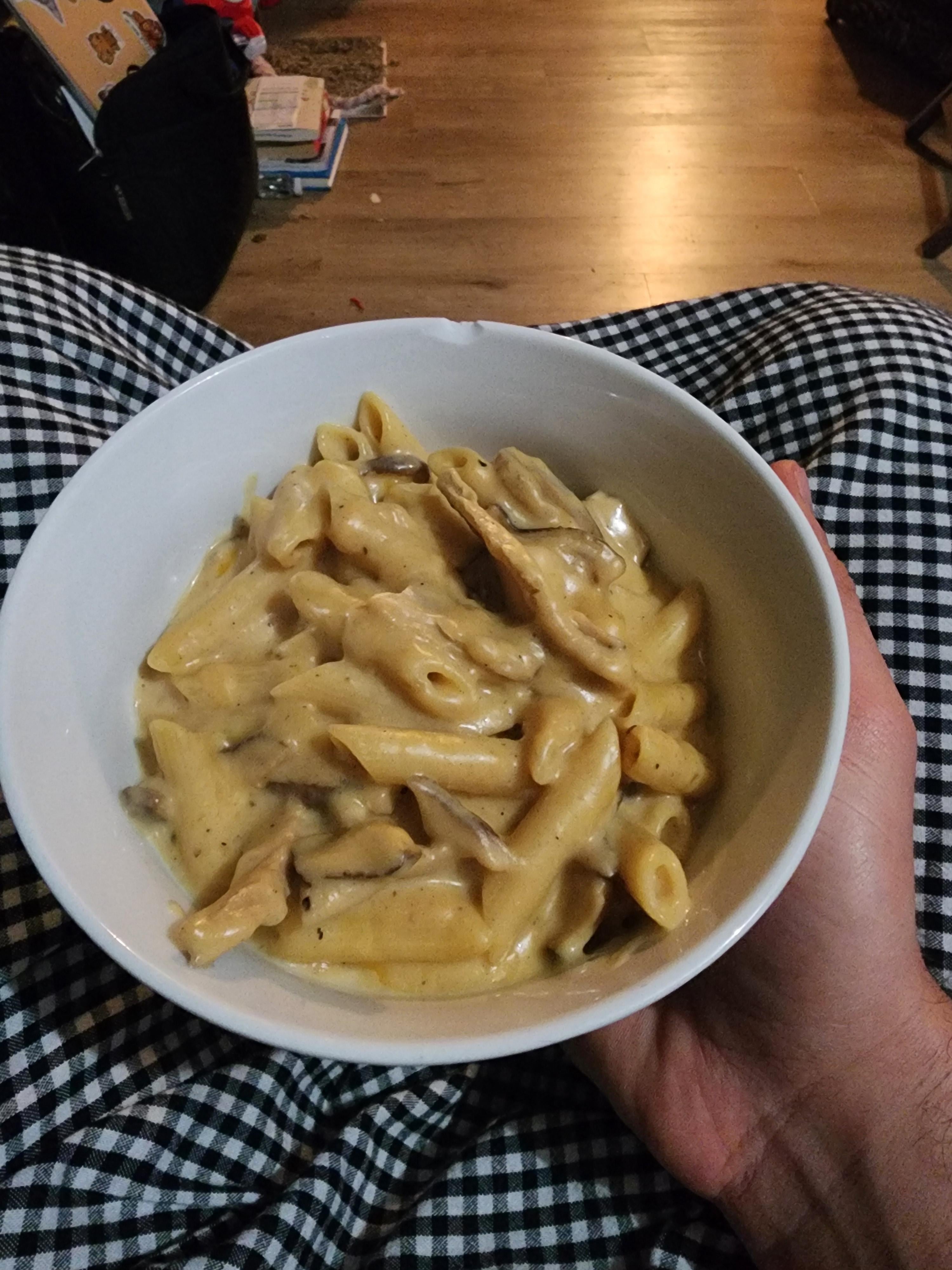Cook penne, mushrooms, and chili peppers together in salted water until the noodles are Al dente (7-8 minutes). Strain the mix, pick out and discard the chilis.