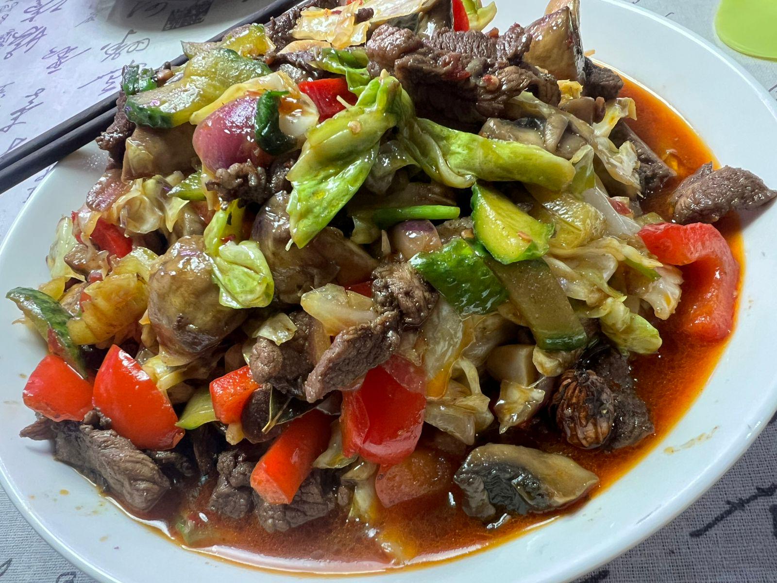 A home-style dish: pork with mushrooms and common vegetables. A little game of flavor and color on the plate. It radiates warmth and calm. by ChineseAndrey Food Porn