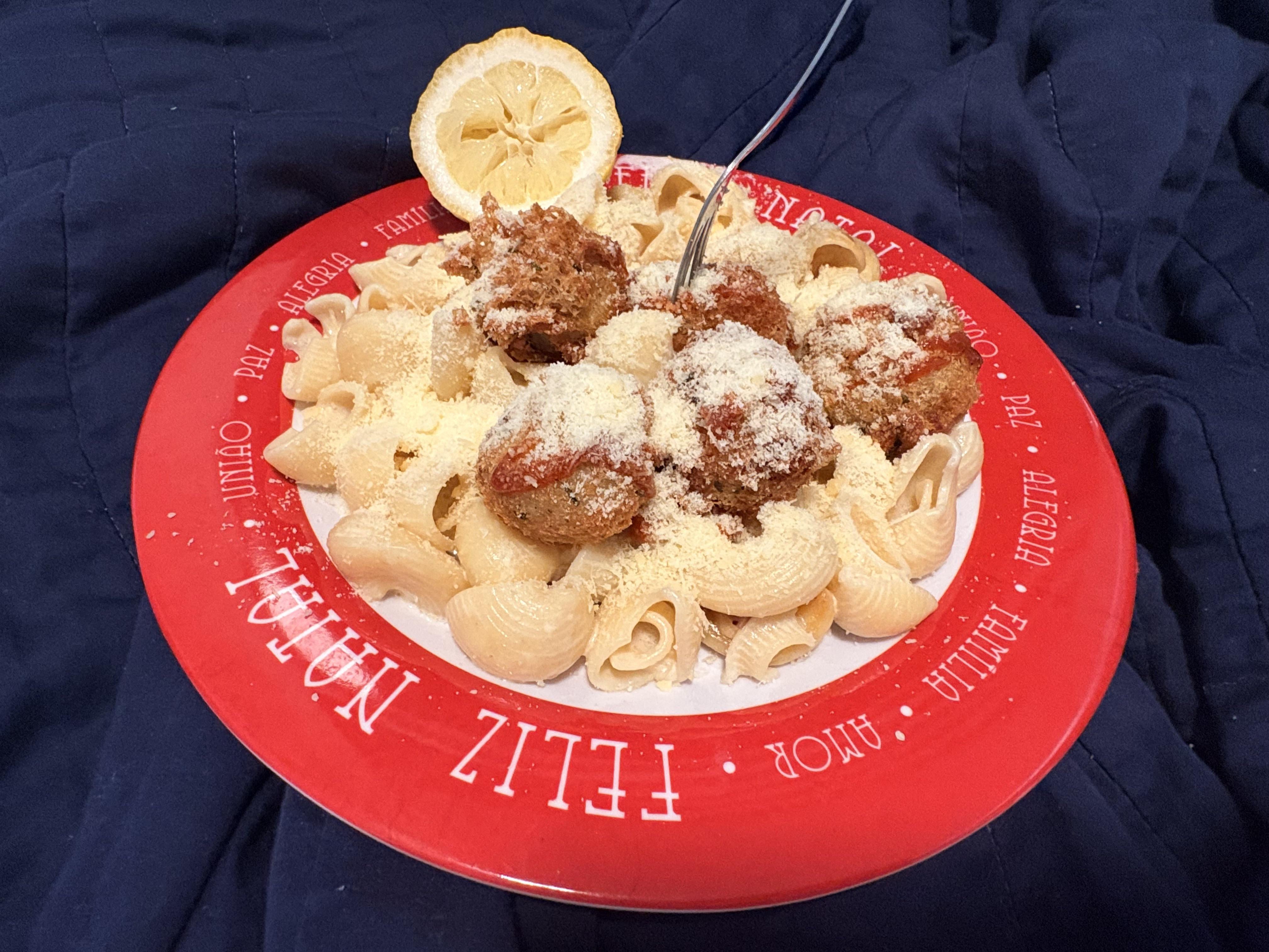 Deep fried cod cakes, garlic, lemon, cheese, pepper, pasta