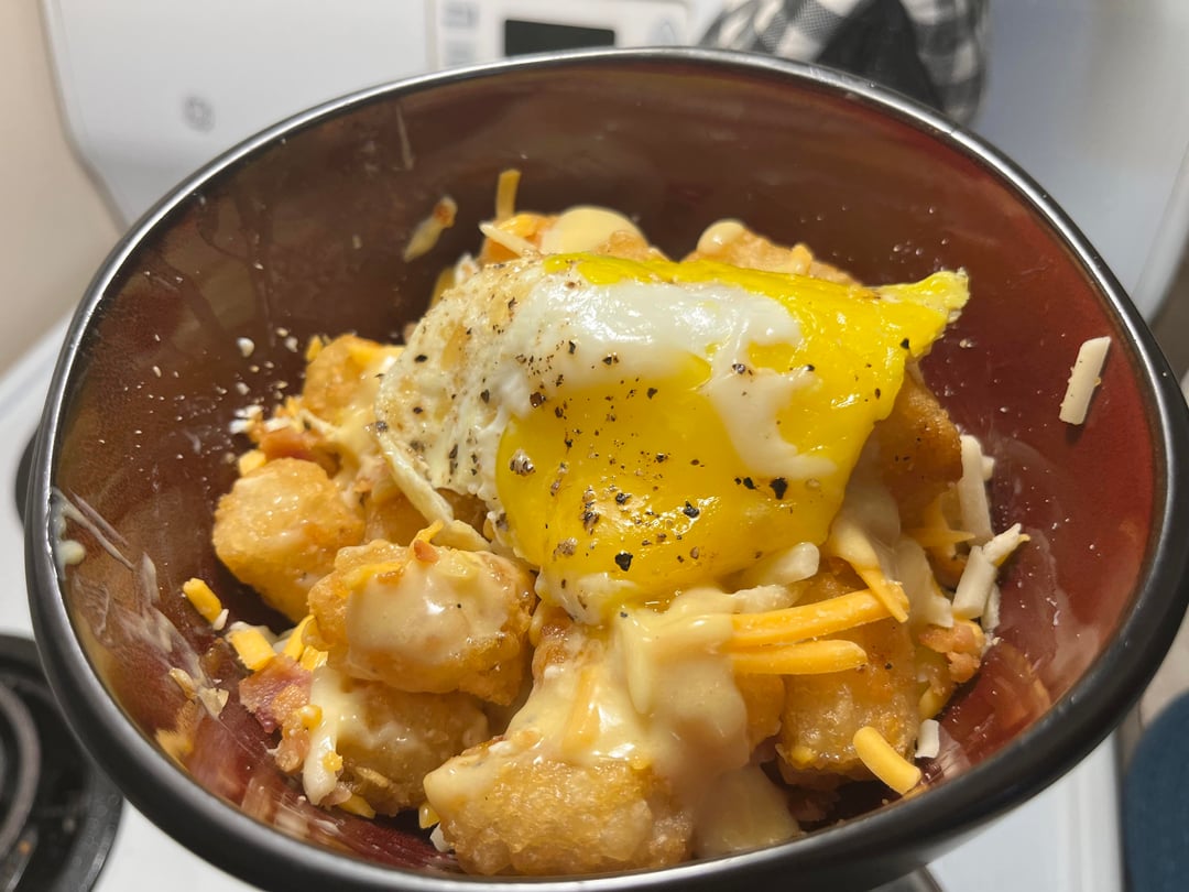 breakfast for dinner – communal tater tots, bacon and hollandaise. bf scrambled for a wrap and i fried for a bowl. hell yeah.