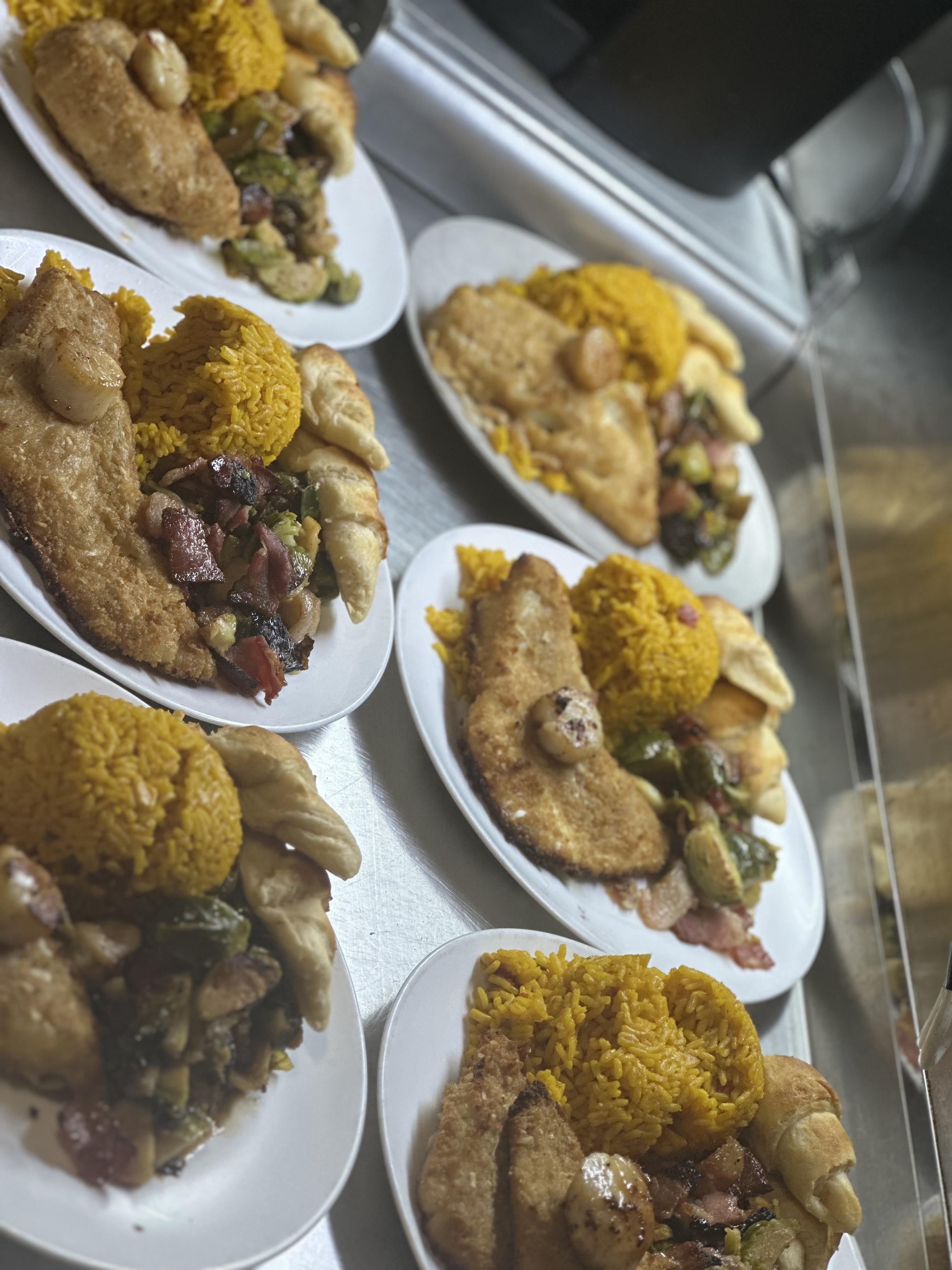 Fish dinner at work. Rice, Brussels w/bacon, rolls, each 🐟 crowned with a scallop. by inflatable_pickle Dinner Tonight Tonight's Dinner