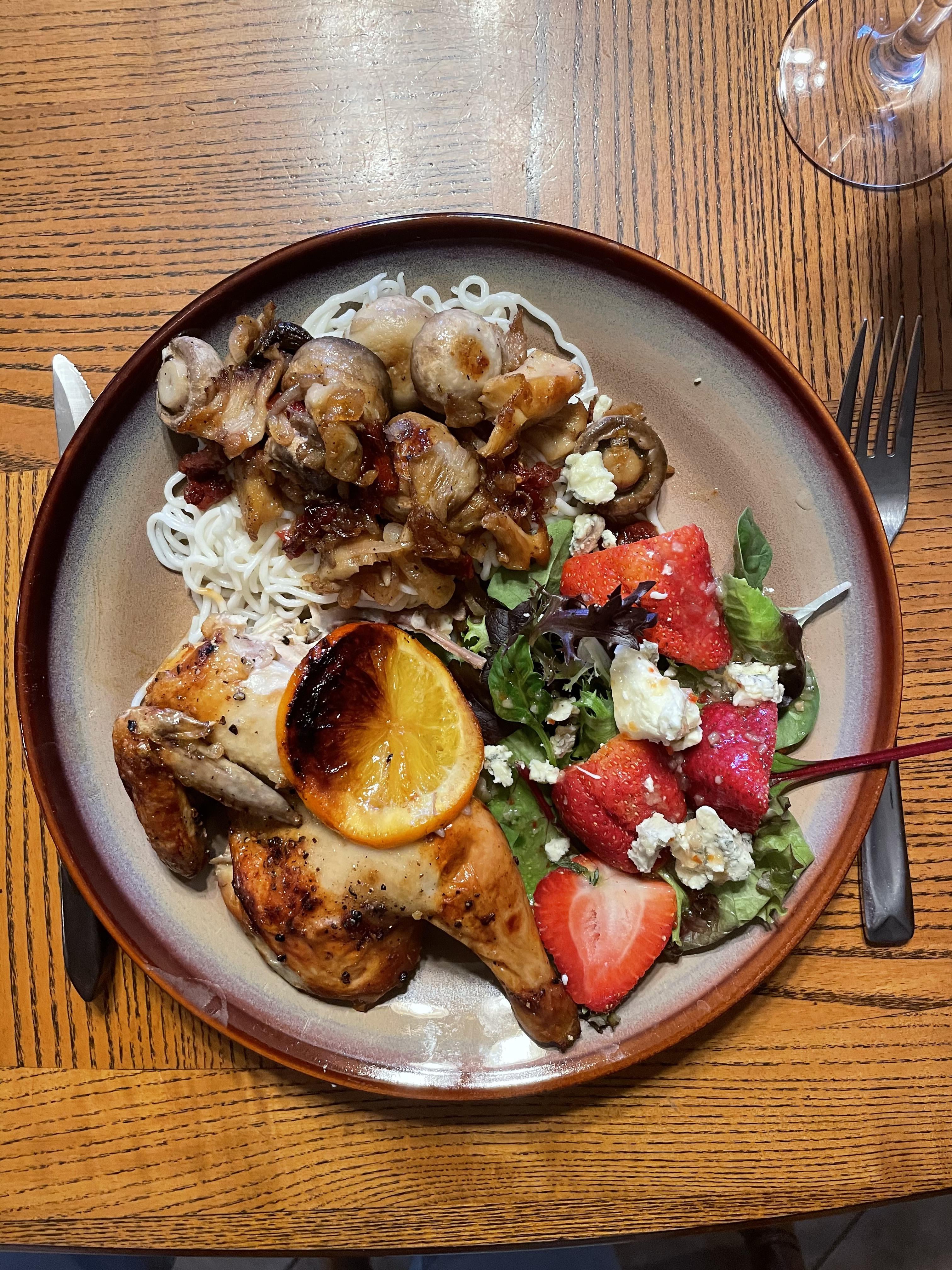 [Homemade] Citrus-Roasted Chicken served with Caramelized Mushrooms, Noodles, and a Strawberry Feta Salad.