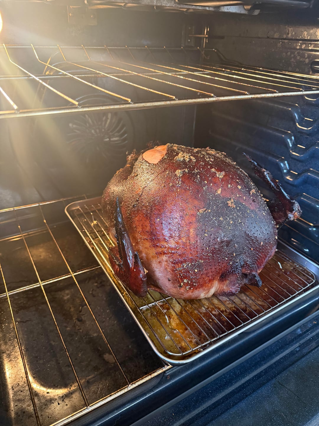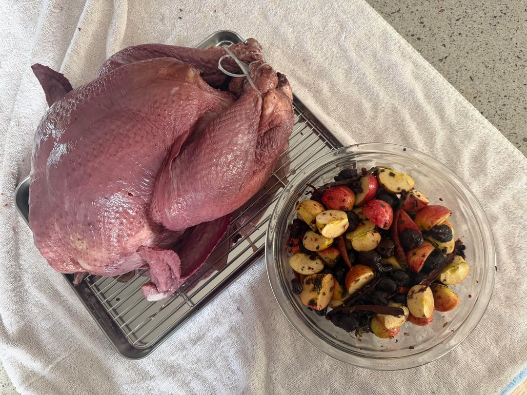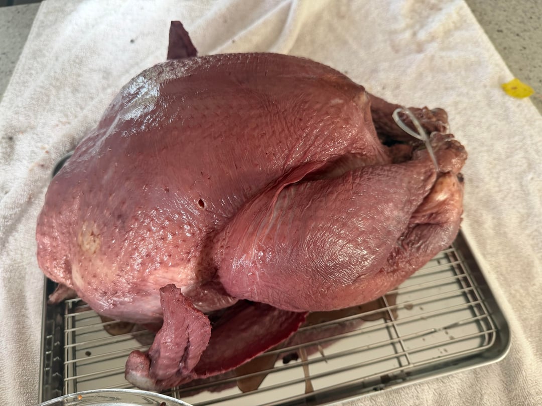 I normally use apple juice as the sugar component of my brine but the grocery had ran out so I grabbed grape instead. As I dunked the turkey it occurred to me that the bird was probably going to stain. The color came out a bit darker but it was probably the best turkey I’ve made to date.