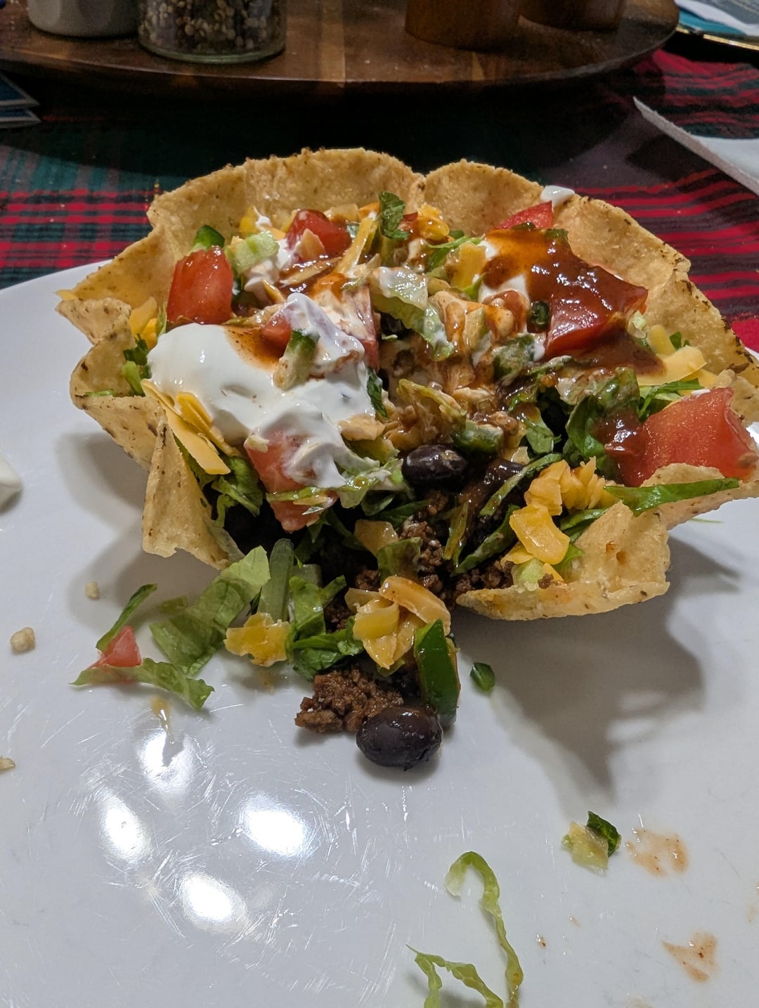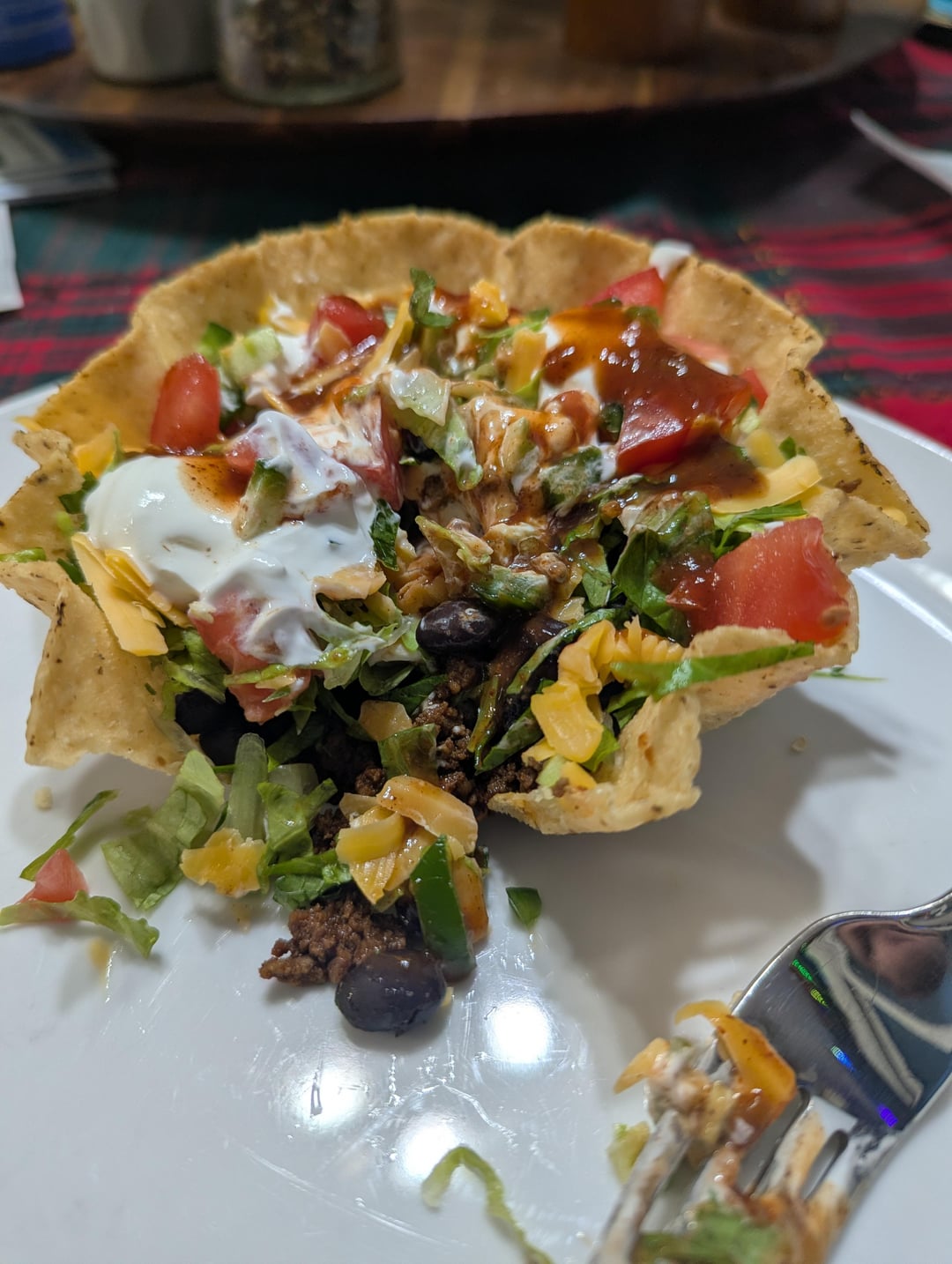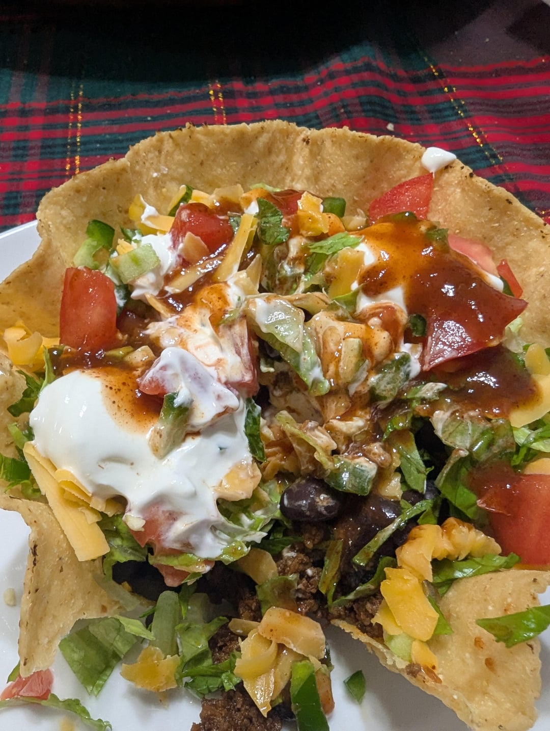 Taco Salad — loaded up with crisp lettuce, seasoned beef, melty cheese, salsa, sour cream, and that crunchy tortilla base we all love! 💥