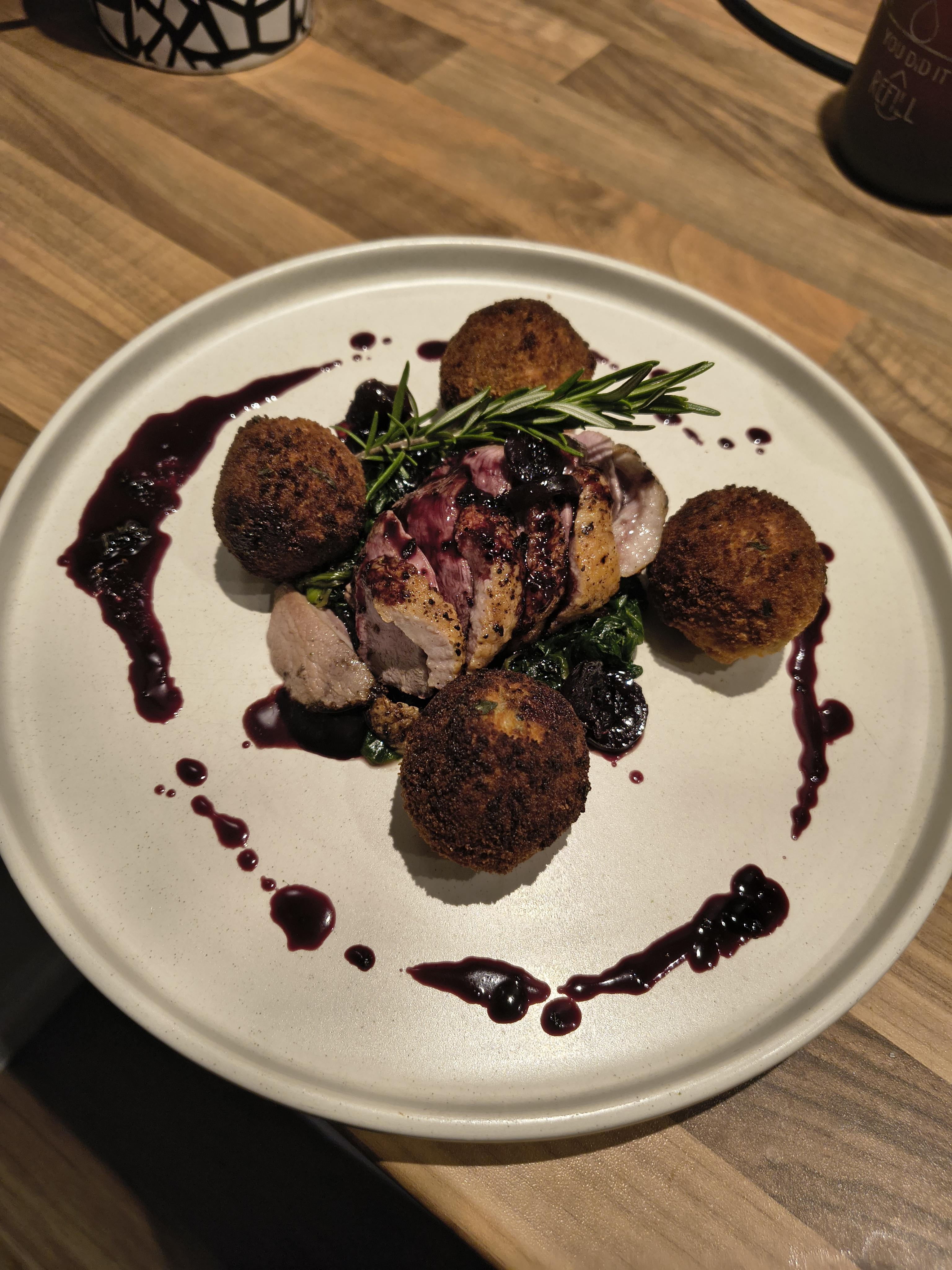 Duck, black pudding & cherry thyme encrusted spheres, red wine reduction