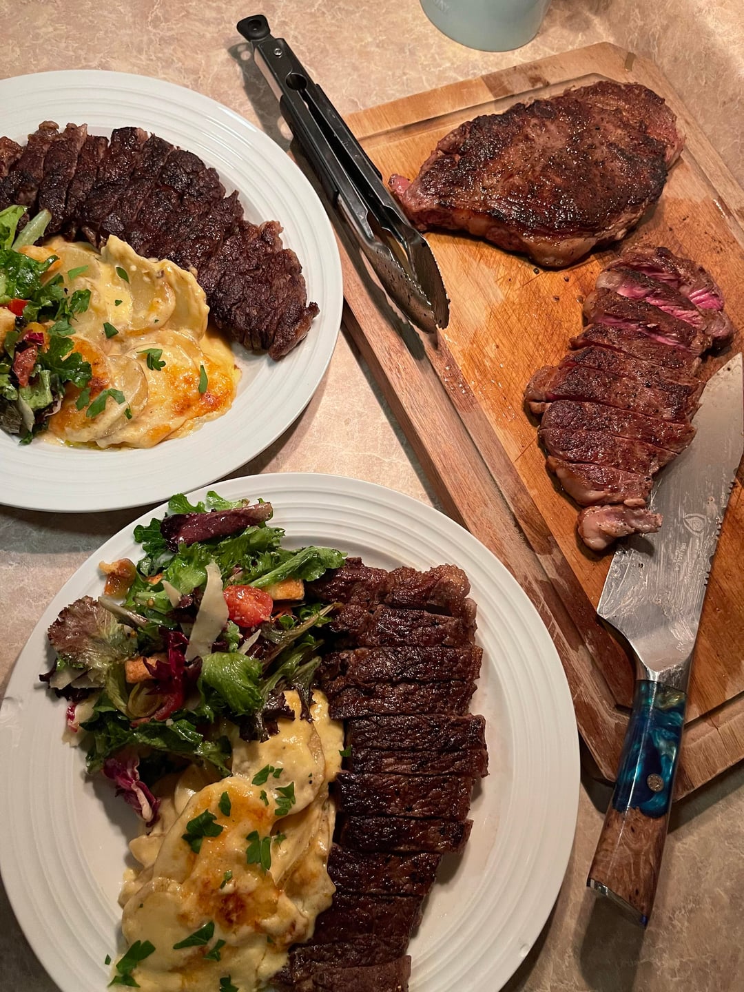 [homemade] NY strips, potatoes au gratin, spring mix salad and vinaigrette